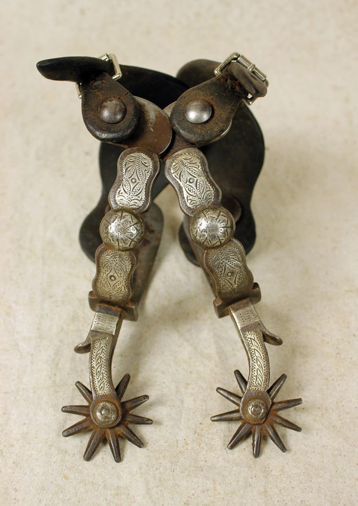 Nice early Buerman single inlaid spurs with fancy engraving, early AB marks, and deeply chased iron off sides. With great bunkhouse made Montana Territory straps.