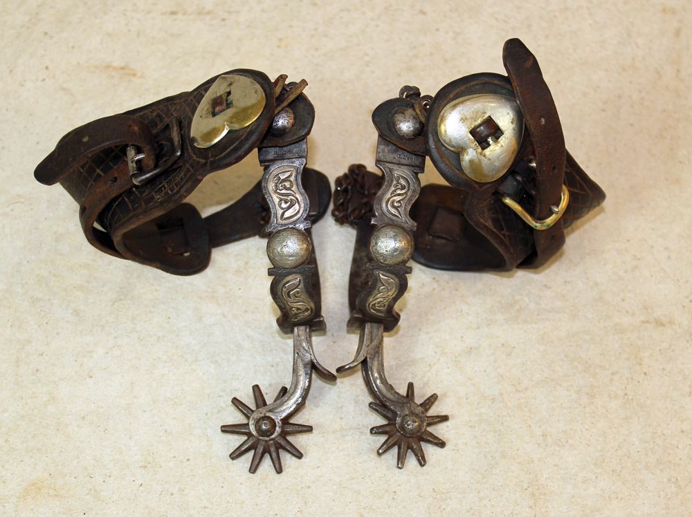 Very unusual early single inlaid spurs with scalloped heelbands, rarely seen repose' inlaid silver, drop shanks and nice original straps.