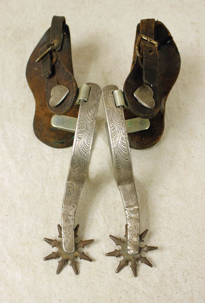 Fully silver overlayed spurs with fine engraving, heart buttons and snowflake rowels. Marked under the button.