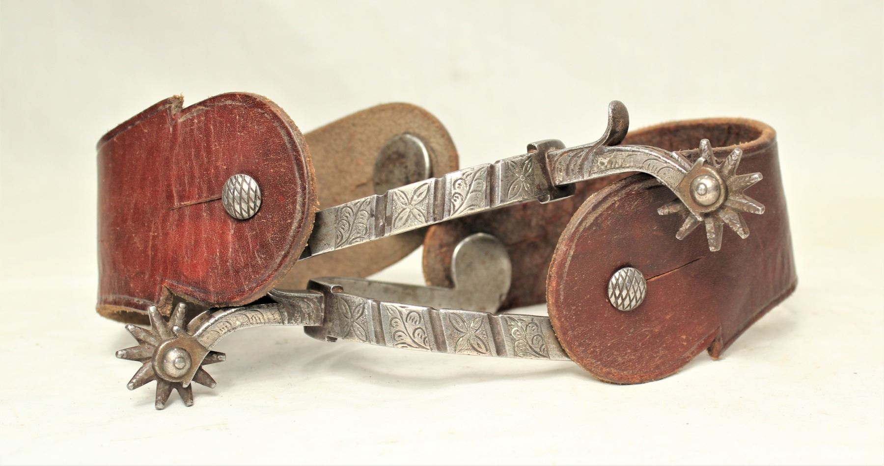 Very early single inlaid spurs with fine grooved heelbands with engraved silver bands. With cross hatched buttons, period straps, and early Star AB mark.