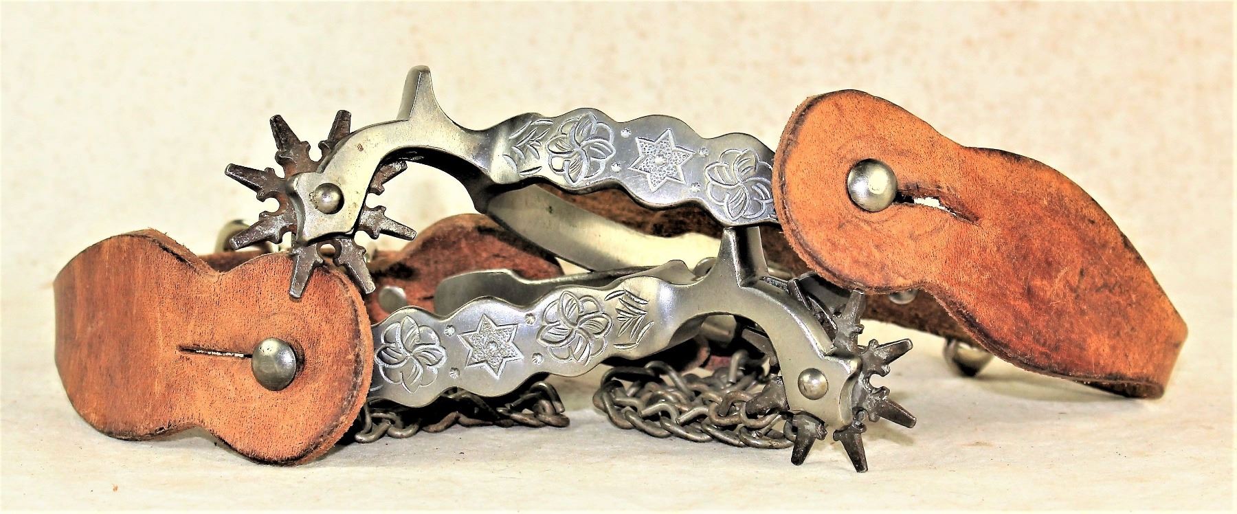 A great pair of early marked spurs with radical drop shanks, snowflake rowels and scalloped heel bands.