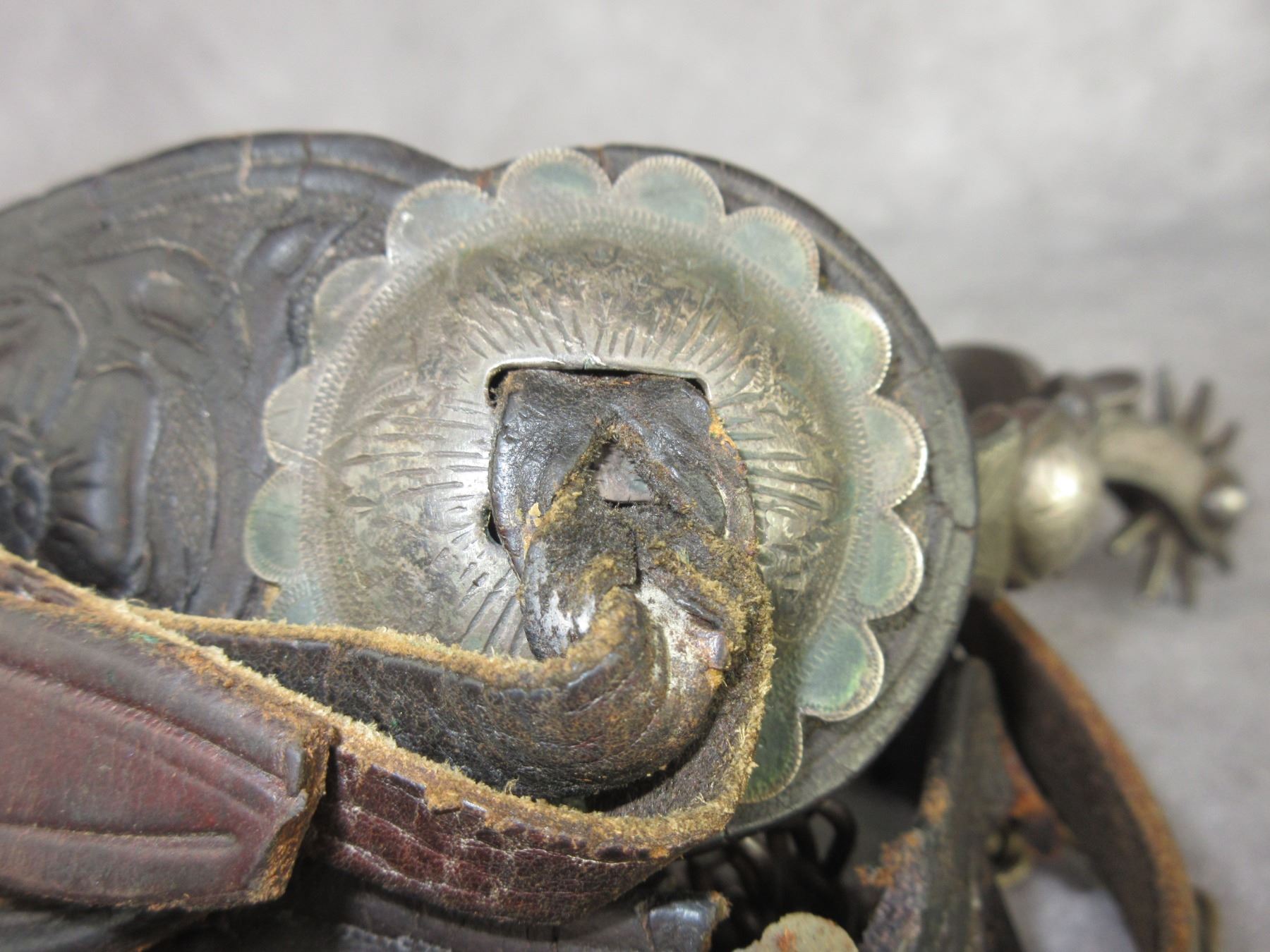Buermann Hand Forged Steel Silver Inlaid Spurs- .8" Bands- 2" Drop Shanks- 1.75" 10 Point Rowels- Chap Guards- Double Heel Chains- Chased Inside- Damaged Tooled Straps With 2" Slotted Silver Conchos- Decent Condition