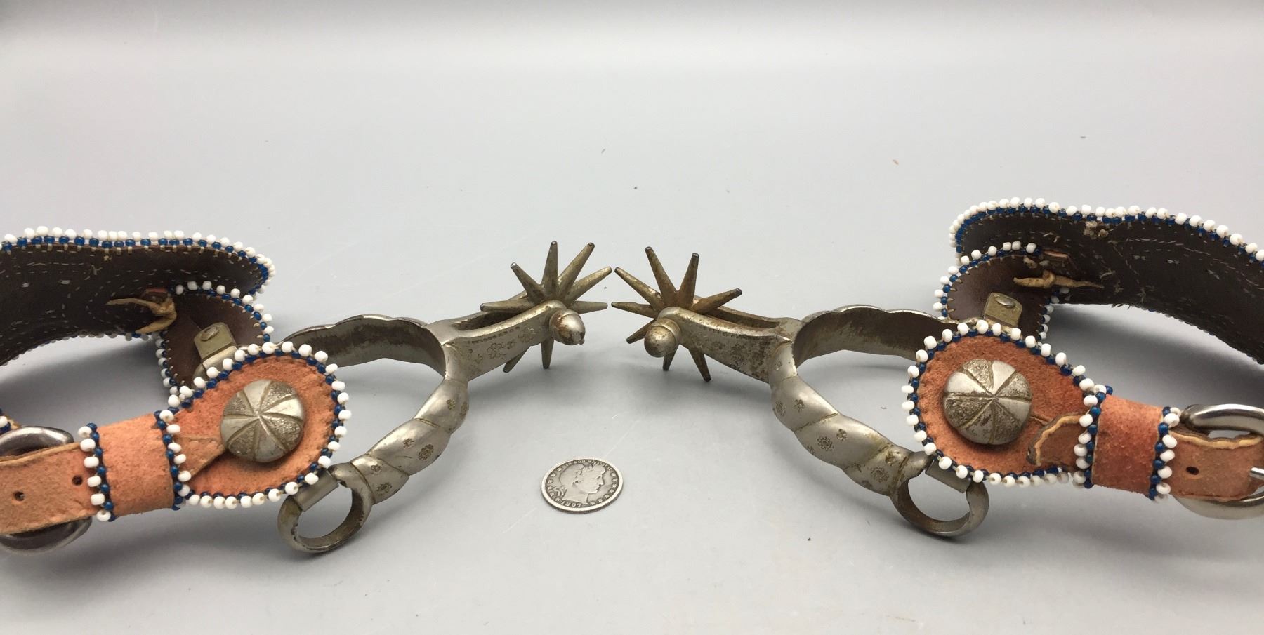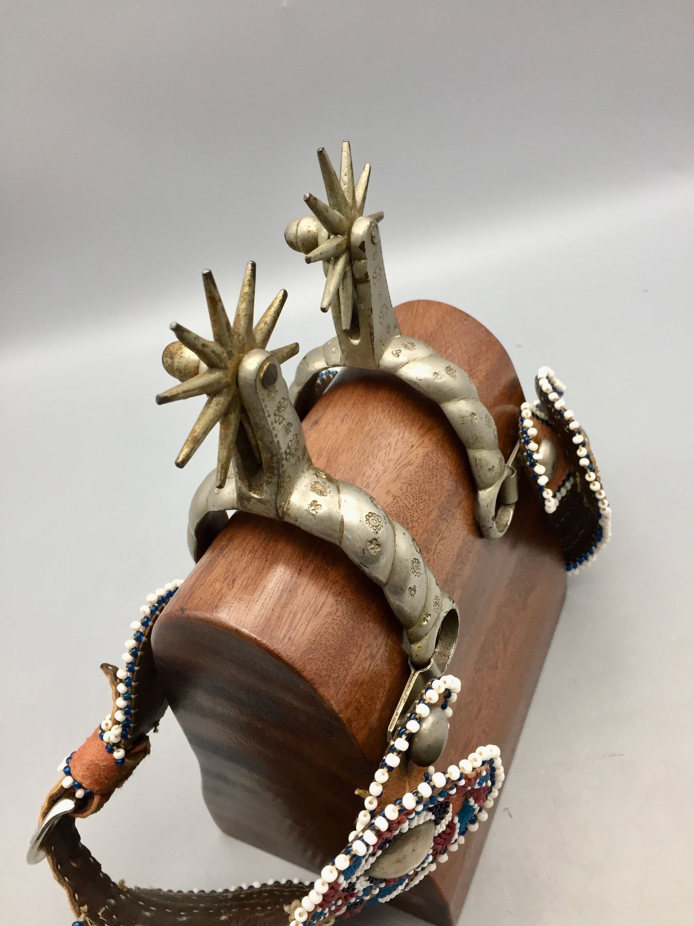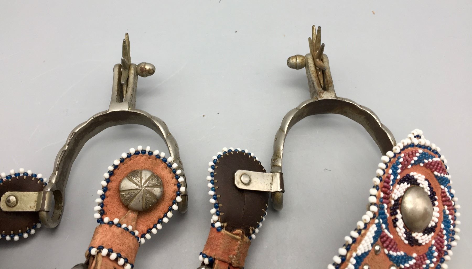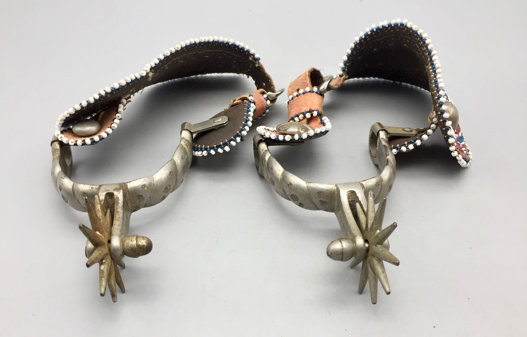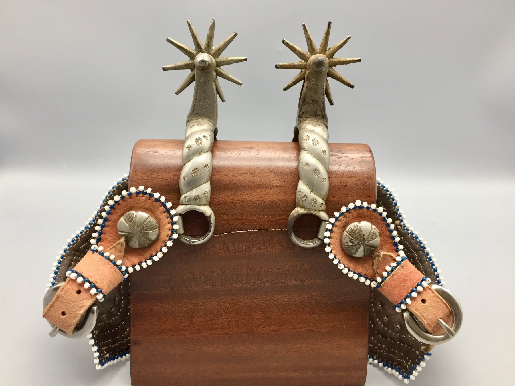 Description: Offered for sale in this lot is a pair of Buermann Spurs with brown leather, beaded straps and silver accents.