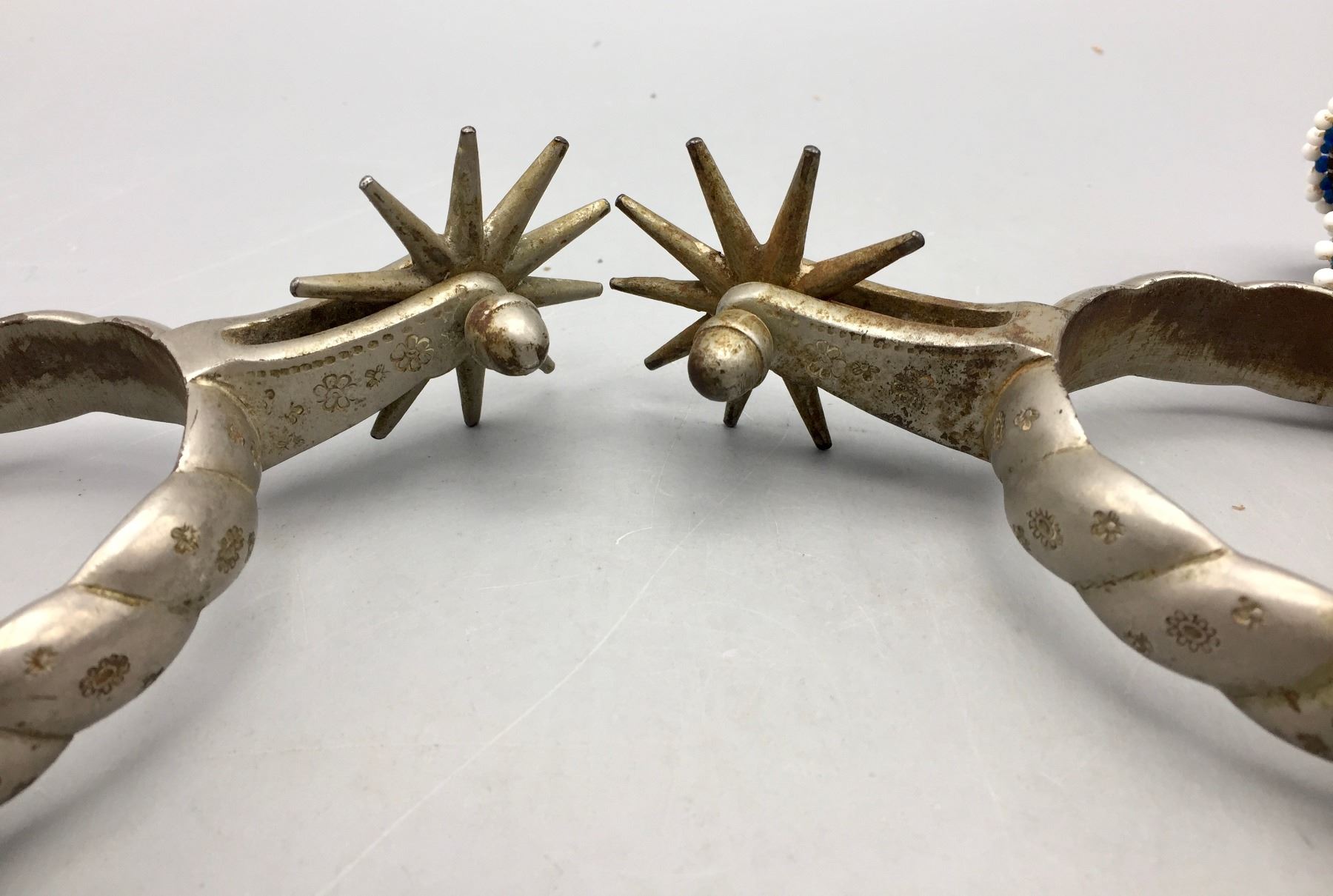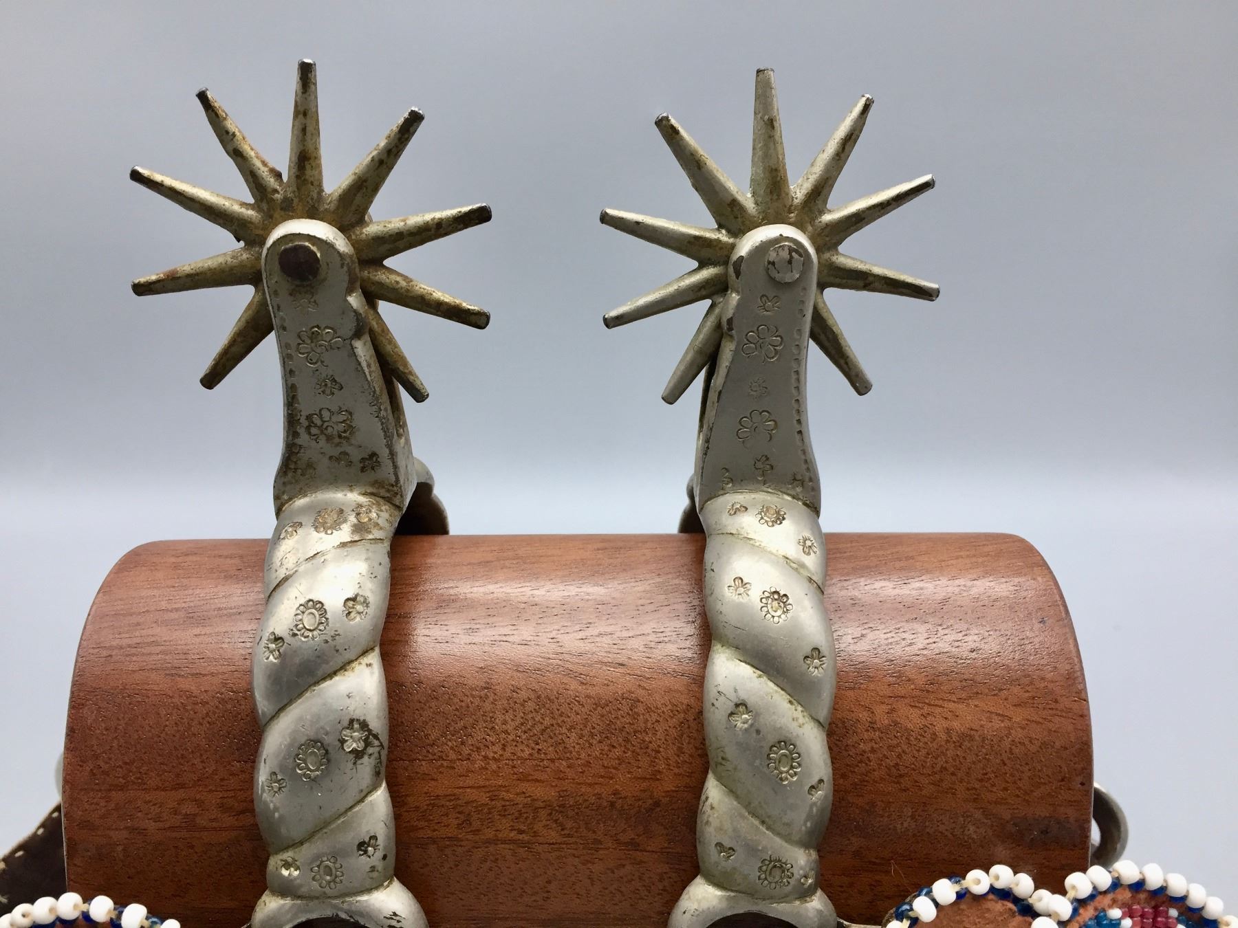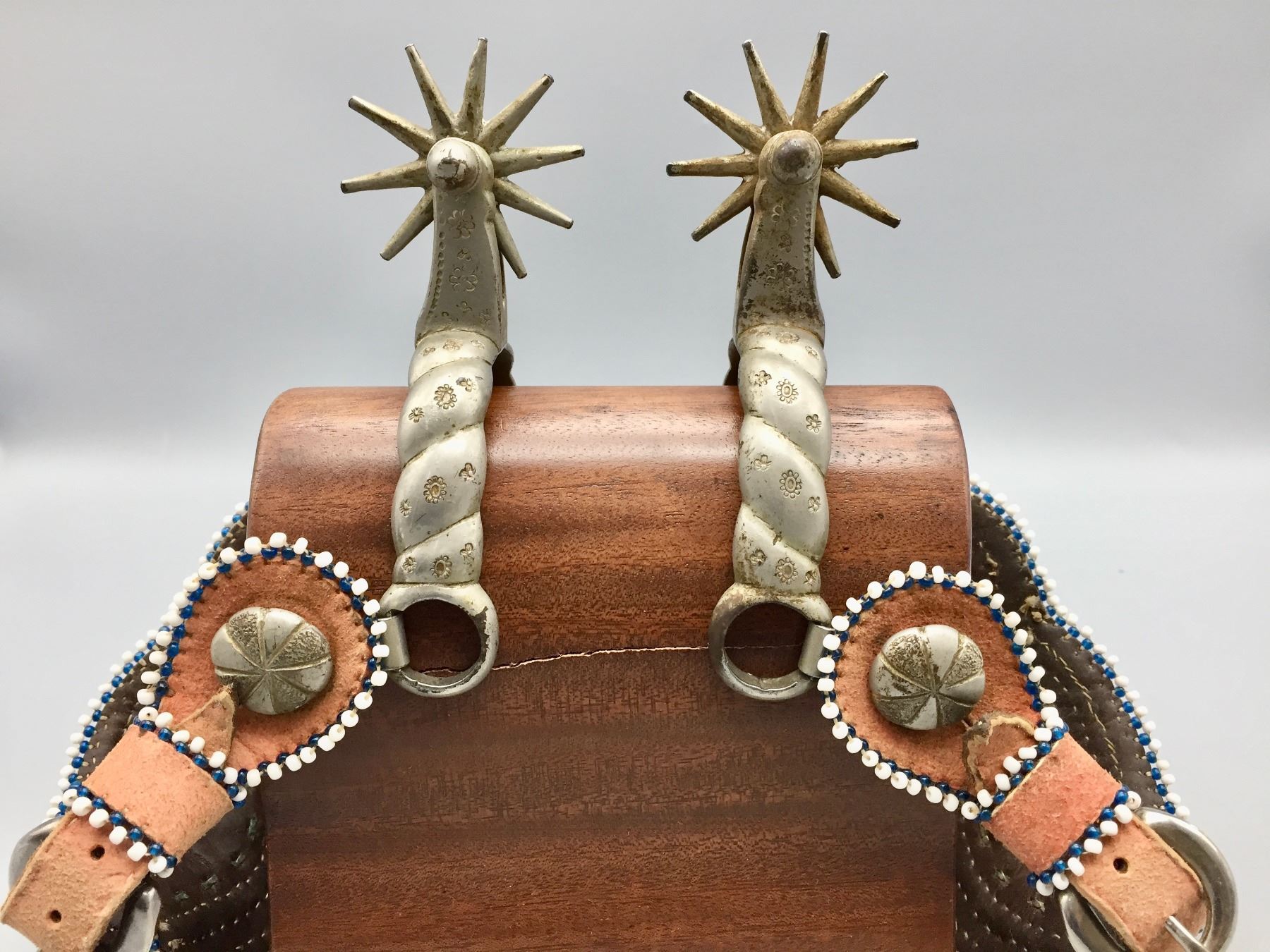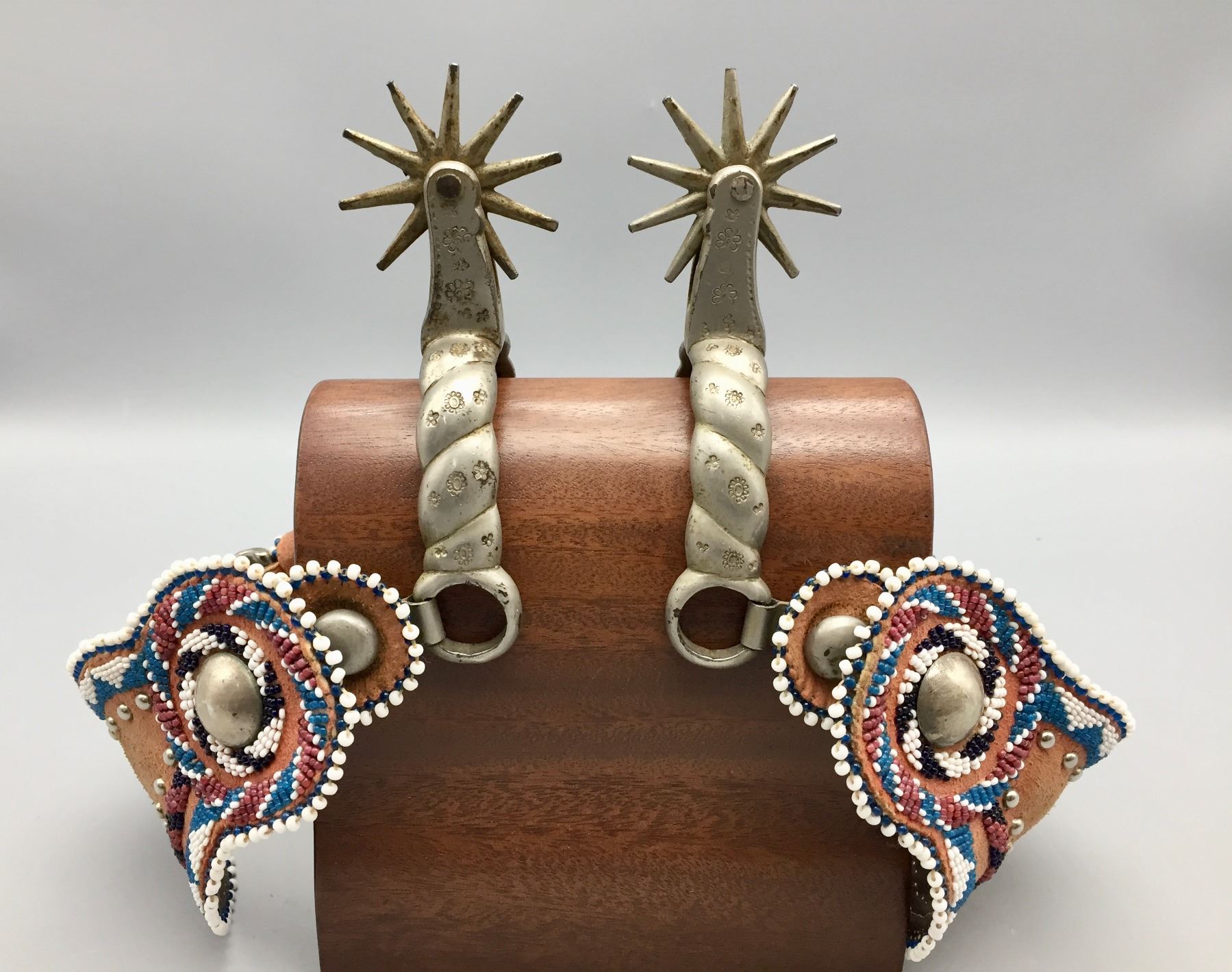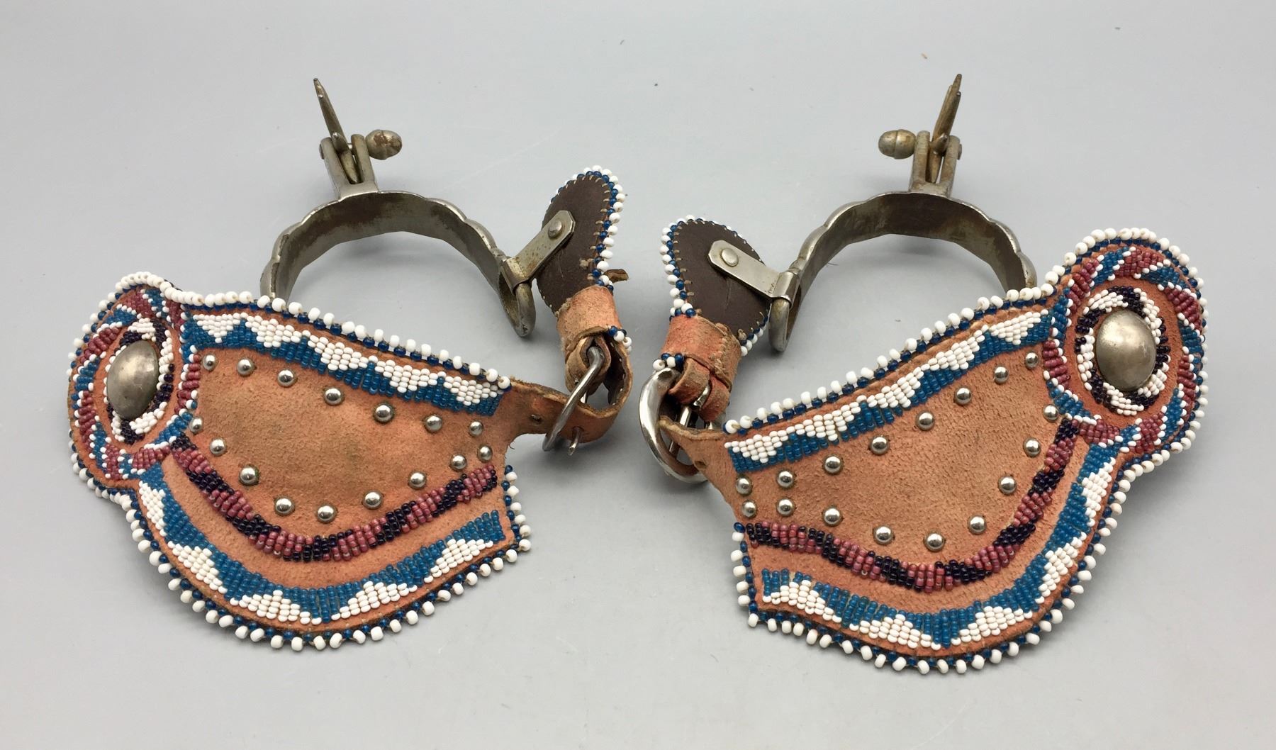 Description: Offered for sale in this lot is a pair of Buermann Spurs with brown leather, beaded straps and silver accents.