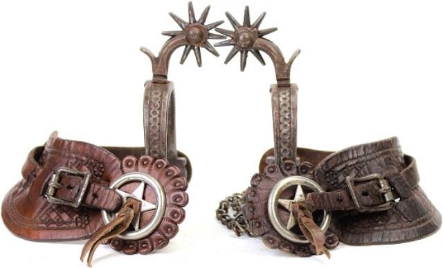 in fine original unrepaired condition, 1 1/2" - 10 point rowels, great old 2 piece unmarked leather straps.