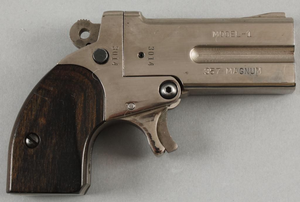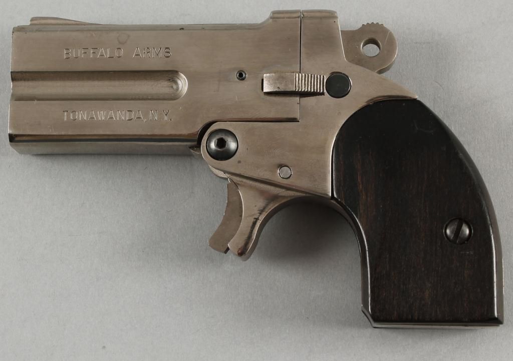 Buffalo Arms Mdl 1 Derringer Cal .357 SN:3014Single action spur triggered double barreled over-under derringer, polished stainless steel finish, fixed sights, wood grips, 3" barrels, fair bore and good action. Condition: Good.