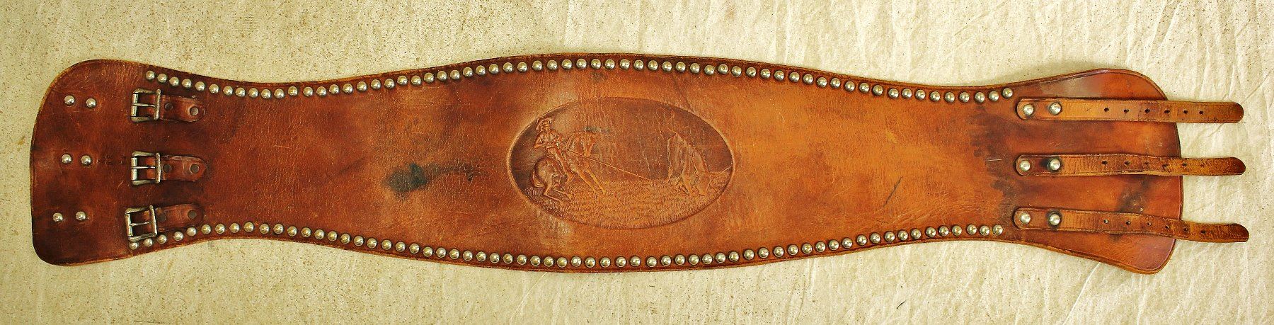 Appealing light colored bronc belt with pictorial impression of Buffalo Bill roping a steer, over sized with nickel studded border.