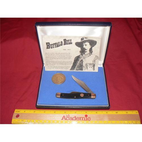 Buffalo Bill Cody Commerative Knife and Coin set. This set is boxed and contains the 2 year warrenty paper dated 1976. Serial number is 04439. There is a nice write up of Bill Cody as well. The knife is inscribed "W.F. Cody Buffalo Bill 1846-1917. There is a engraved likeness of Buffalo Bill on the handle on one side. The coin has Buffalo Bill's image on one side and Schrade Cutlery Corporation Buffalo Bill Limited Edition on the other. This is a great Buffalo Bill collector's set. It is in excellent condition.