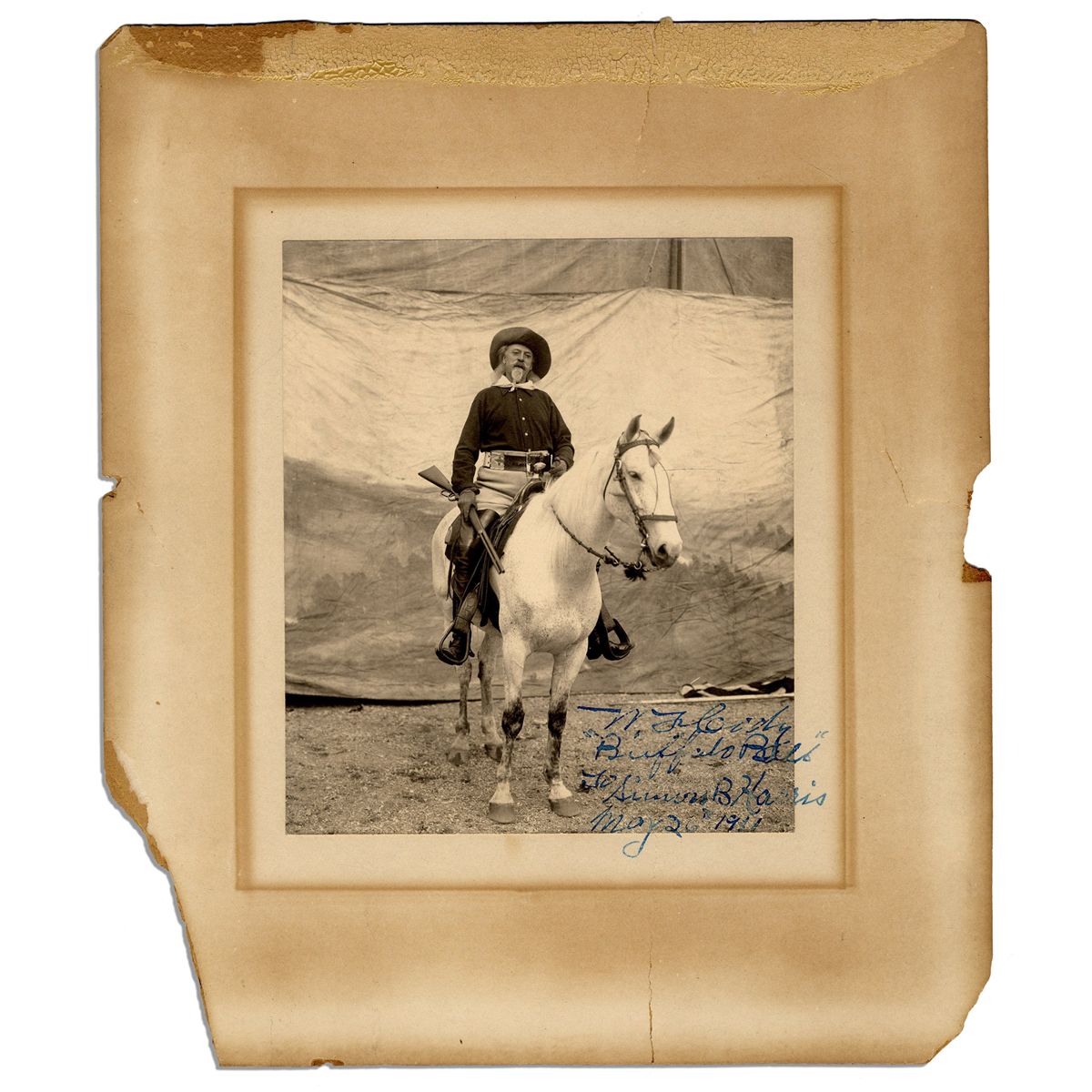 ''Buffalo Bill'' Cody signed portrait of himself upon his horse with rifle in hand. The Wild West man signs in blue ink, ''W.F. Cody / 'Buffalo Bill' / To Simon B. Harris / May 26th 1911''. Original photo from the early 1900's has an Elmer Chickering blindstamp; the Chickering Studio in Boston took several well-known photos of Cody. 5.75'' x 6.5'' photo is in fine condition, matted to a size of 10'' x 11.5''. Outer edges of mat are chipped and torn, not affecting photo or signature. Writing extends past the photo onto approximately .5'' of the mat; fortunately this portion of the mat has no toning. A stunning signed image that brings the Wild West alive.