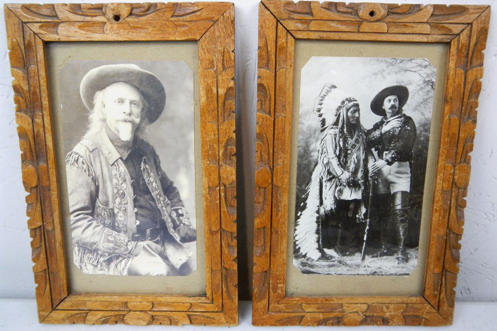 Buffalo Bill Pictures - Here is a collection of two framed pictures of the famous Buffalo Bill, these are believed to be postcards that were glued to the backing, as so the age is unknown. These are framed and hand carved wood frames with glass and each measures 5.5"x8.5" framed.