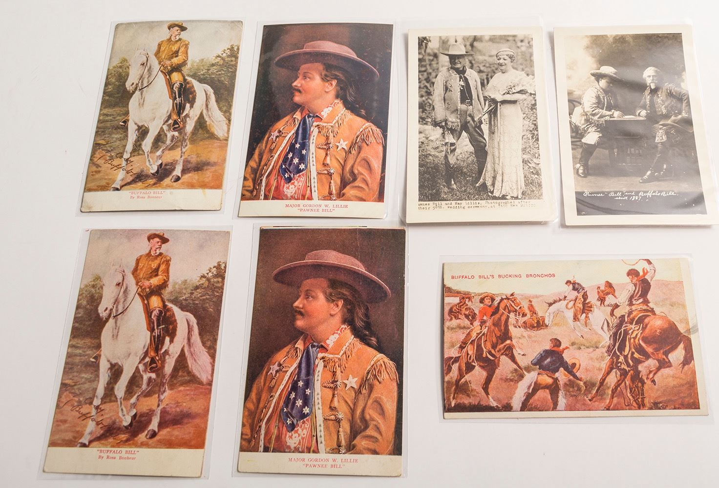 The two greatest Wild West showmen in one lot of seven postcards. Includes 1) the 50th wedding anniverary of Pawnee BIll and May Lillie. Photographed at their 50th wedding anniversary in Taos, New Mexico. 2) 1897 reprint photograph of Pawnee BIll and Buffalo BIll signing a document. RPC. 3) Color postcard of Buffalo BIll's bucking broncos, 4-5) two of Buffalo Bill on a horse by Rosa Bonheur, and 6-7) two of Pawnee Bill color portraits. Date: Location: HWAC # 54016