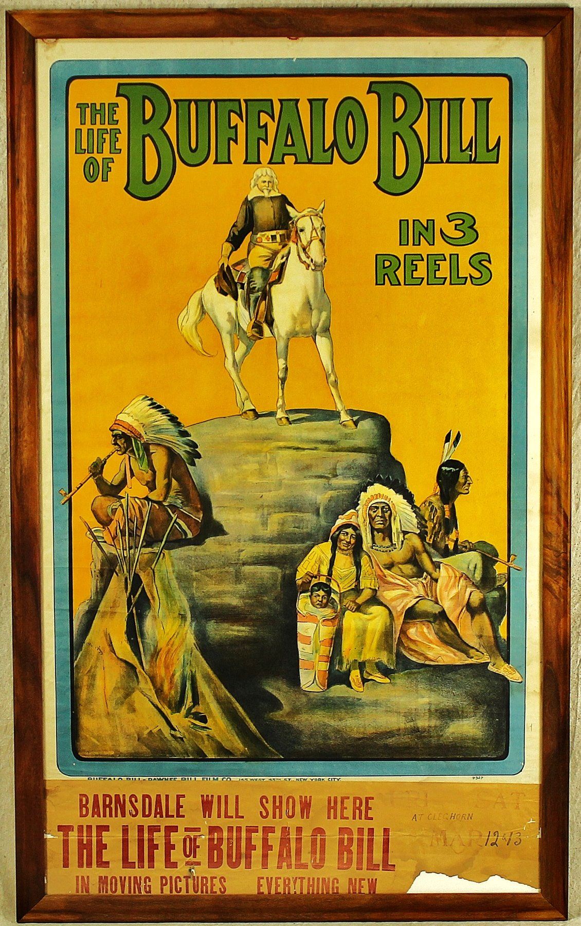 "The Life of Buffalo Bill In 3 Reels". A 1912 lithograph poster with wonderful graphics advertising the movie about the life of Buffalo Bill. Professionally framed, with image measuring 27"x 41".