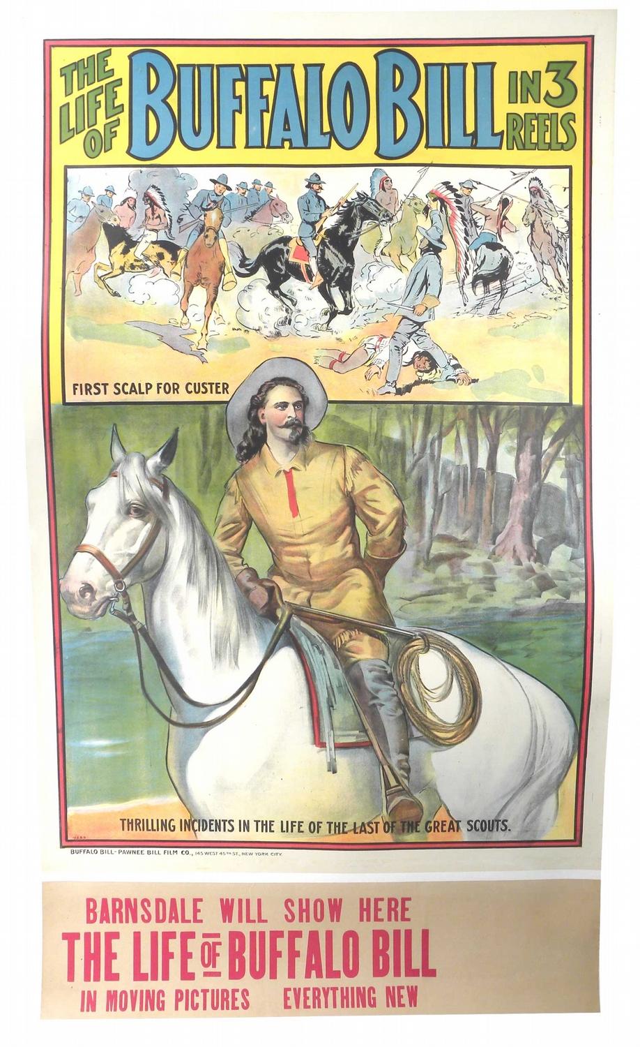 Buffalo Bill Single Sheet Show Poster, entitled, "The Life of Buffalo Bill in 3 Reels". Comes with original snipe, entitled, "Barnsdale will show here". Printed by the Buffalo Bill-Pawnee Bill Film Company, NY. Museum mounted linen. Usual fold creases otherwise excellent condition. 28 X 42 poster/28 X 7 snipe.