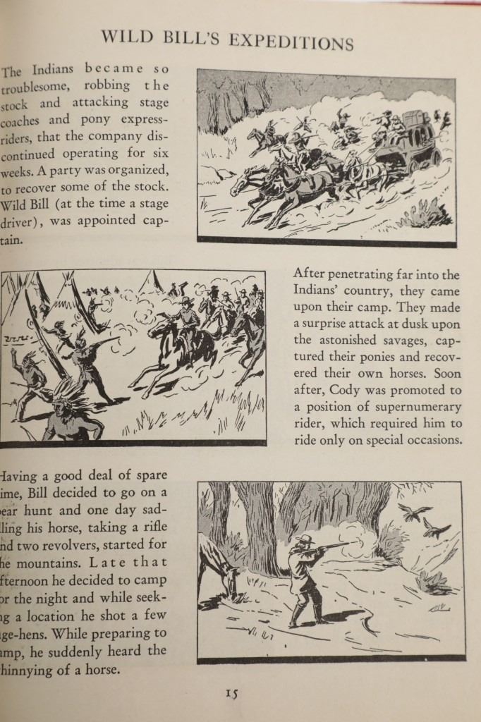 Presented in this lot are Vintage Buffalo Bill and Kit Carson Children's Books (2), circa 1930s. "The Life Of Buffalo Bill In Picture And Story" by C. Richard Schaare, 1937, publisher Cupples & Leon Company, is a pictorial biography of William Frederick Cody, known world-wide as 'Buffalo Bill.' The Western American adventurer worked on cattle ranches, as a guide, fought off Indian attacks and eventually had his own traveling 'Wild West Show.' Illustrated throughout with drawings by the author, C. Richard Schaare. This work written for a younger reader. "Moccasin Trail he Story of a Boy Who Took The Trail With Kit Carson", by Reed Fulton, 1931, Junior Books, publisher Doubleday, Doran & Company, Inc, is a story of Kit Carson and a boy who rode with him. The Moccasin Trail leading west from St. Louis to Santa Fe is the setting for vivid and thrilling adventures in this story of frontier days, and of Kit Carson who helped to make history on that trail. Both of these books were written when the American West was being introduced to wider audiences by radio shows and silent movies. Dime novels of the Old West were very popular with young readers. The gradual transition from silent films to "talkies" (sound cinema) took place between 1926 and 1930 further glamorizing the Western lifestyle. Both books are in good overall condition, scuffing and staining observed on covers and edges. Intact page exhibit age tanning, foxing a slight tears. Books measures 7"W x 10.75"L and 5.375"W x 8"L respectively. Combined weight is 1lb, 6oz.