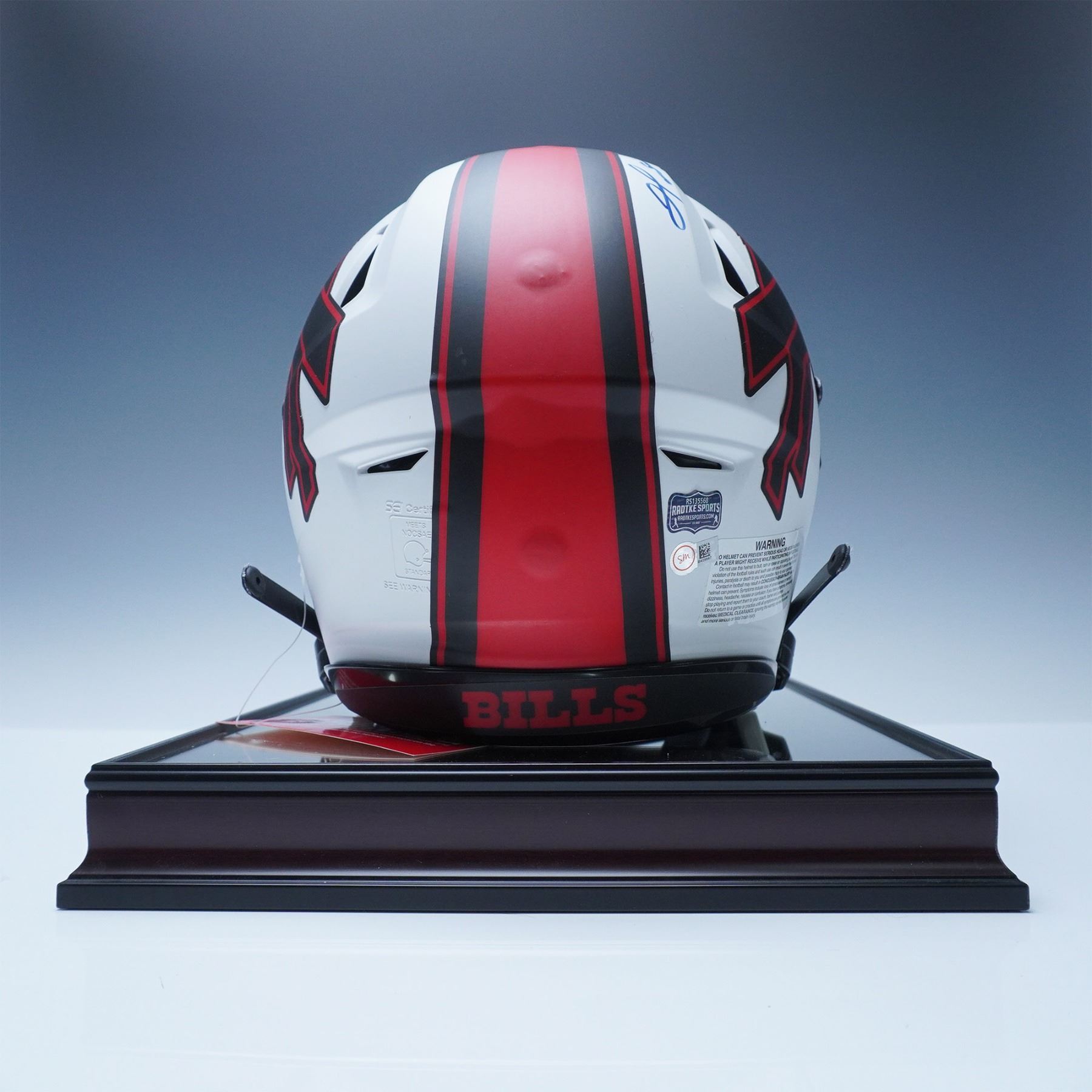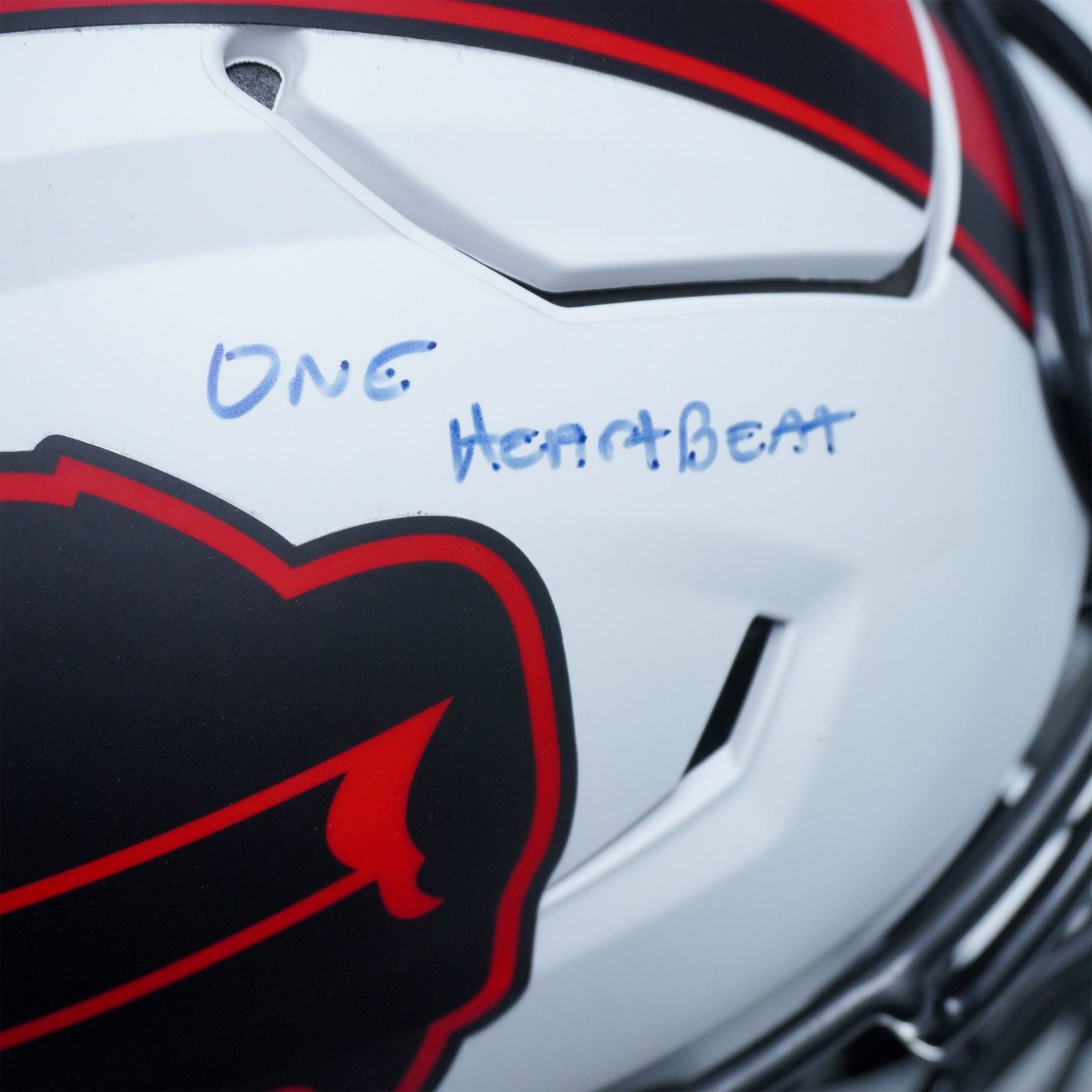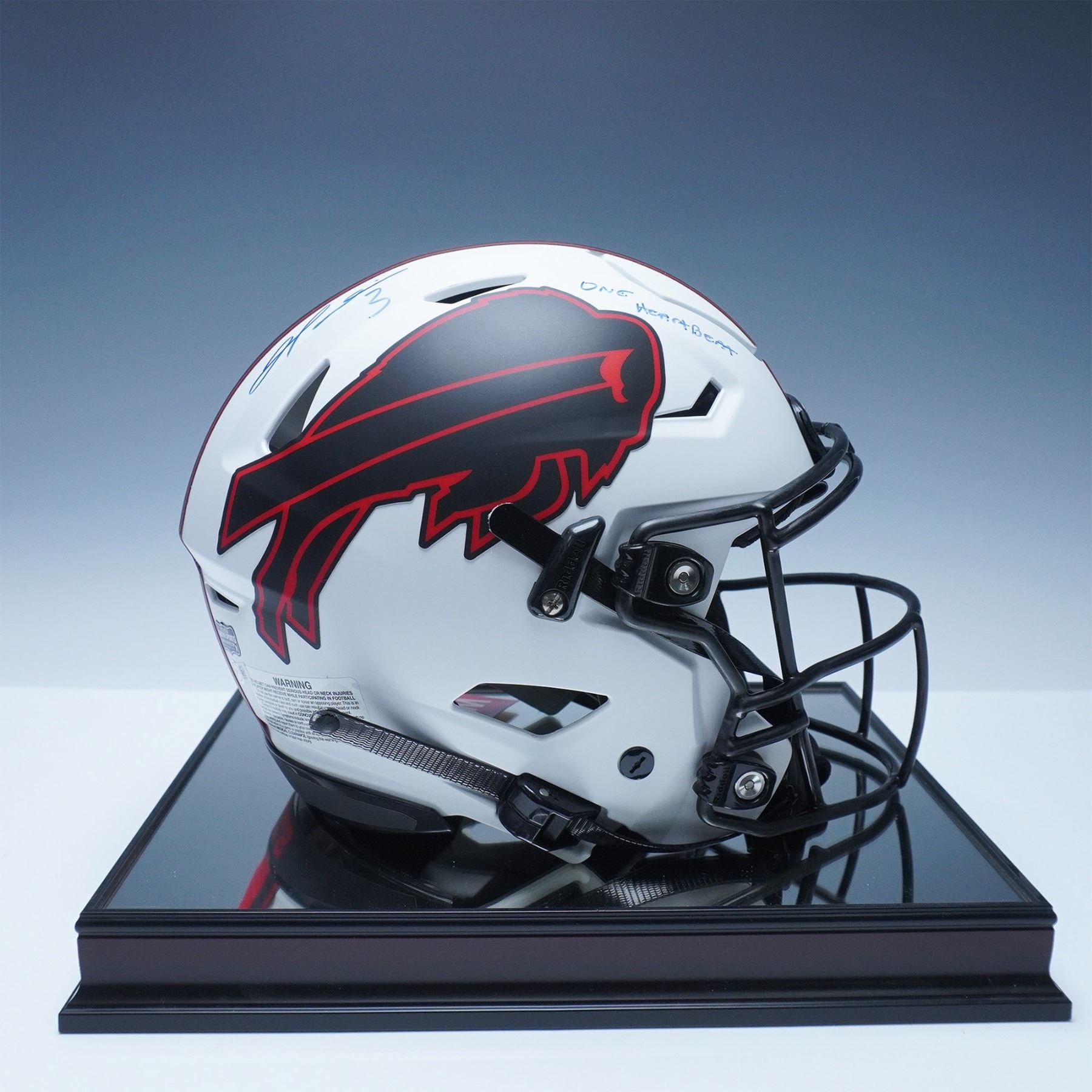 A striking Buffalo Bills full-size SpeedFlex helmet, personally signed by safety Damar Hamlin. This custom-designed alternate helmet features a sleek white matte finish with bold black and red Buffalo Bills graphics. Hamlin has inscribed it with "One Heartbeat", a powerful tribute to unity and resilience. Authenticated by Radtke Sports, the signature and inscription come with certification stickers for verification. Displayed in a premium mirrored case, this signed helmet is a standout addition to any sports memorabilia collection, commemorating Hamlin’s inspiring career and comeback story.