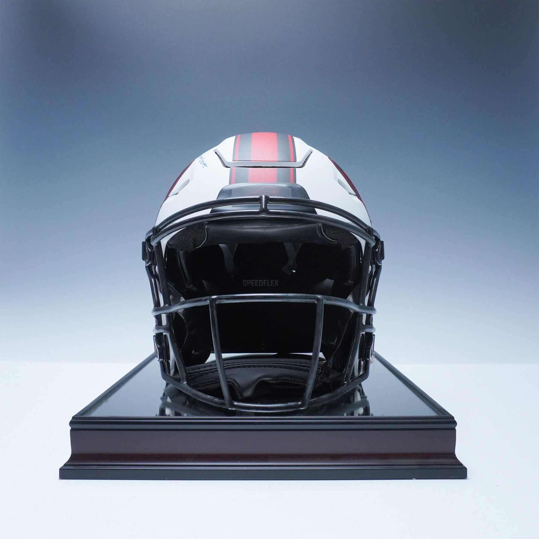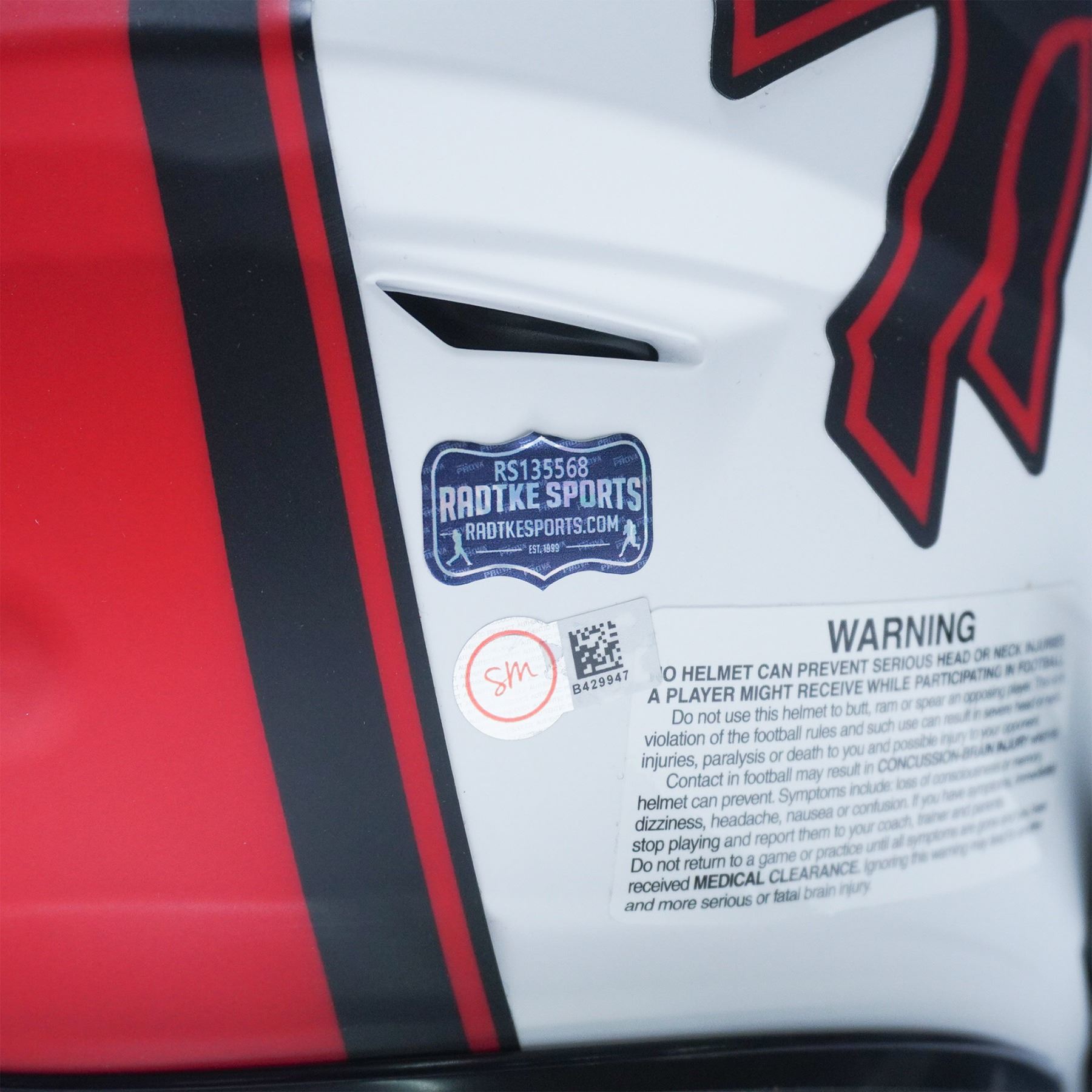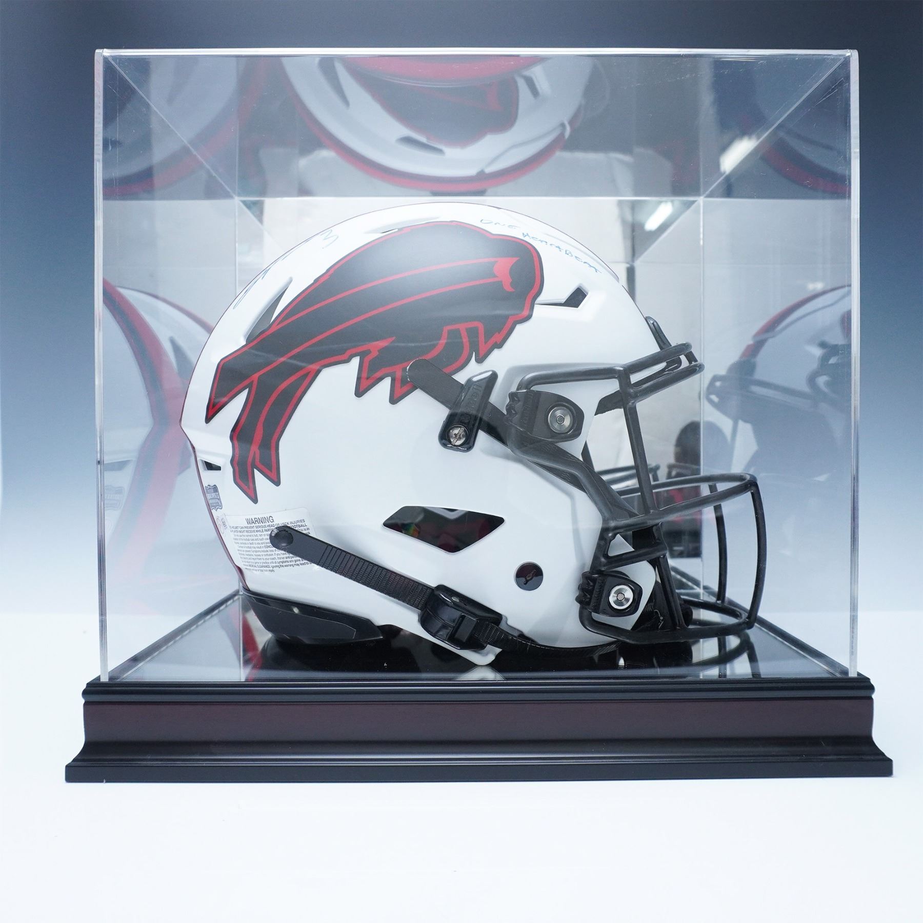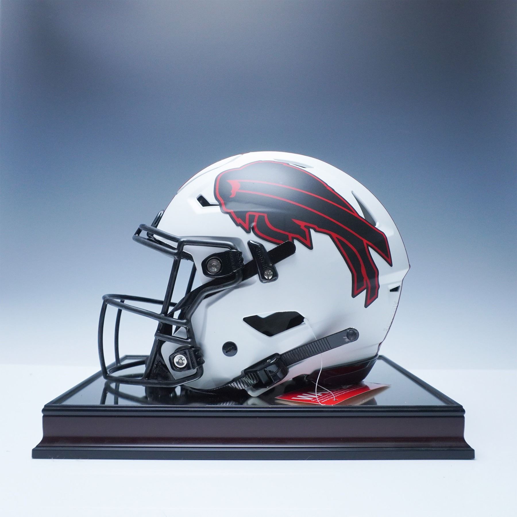 A striking Buffalo Bills full-size SpeedFlex helmet, personally signed by safety Damar Hamlin. This custom-designed alternate helmet features a sleek white matte finish with bold black and red Buffalo Bills graphics. Hamlin has inscribed it with "One Heartbeat", a powerful tribute to unity and resilience. Authenticated by Radtke Sports, the signature and inscription come with certification stickers for verification. Displayed in a premium mirrored case, this signed helmet is a standout addition to any sports memorabilia collection, commemorating Hamlin’s inspiring career and comeback story.