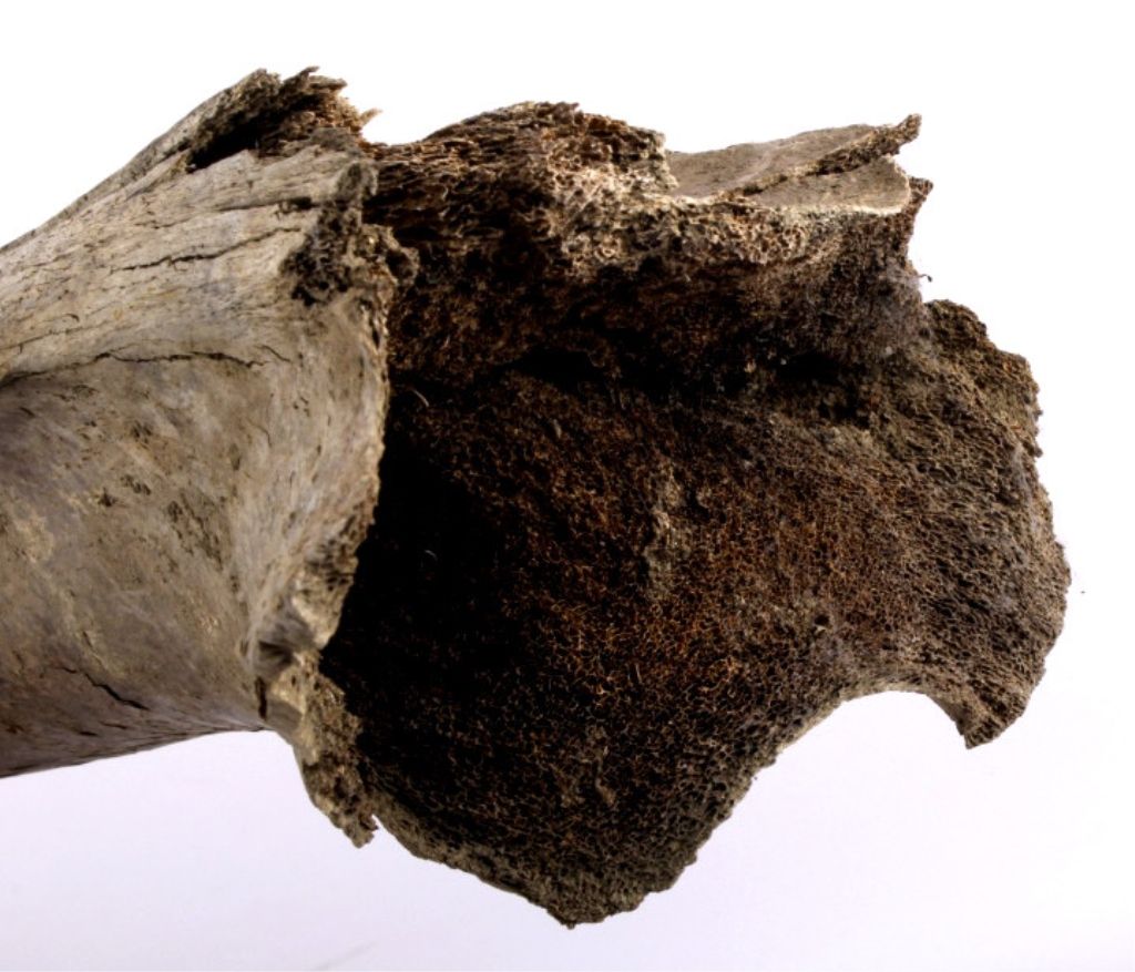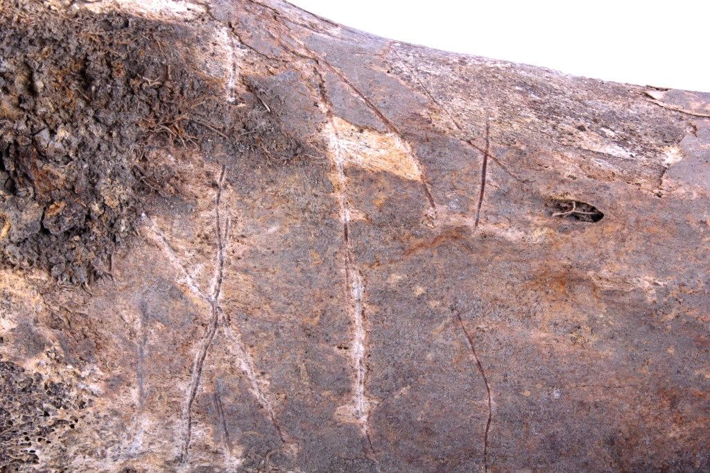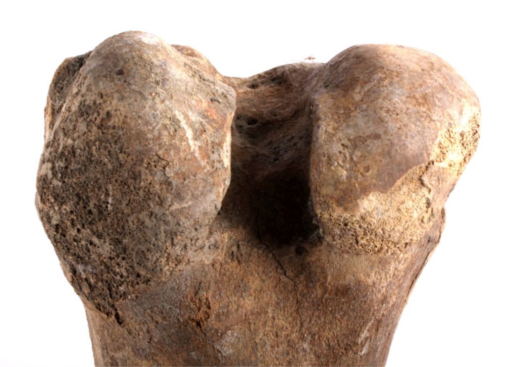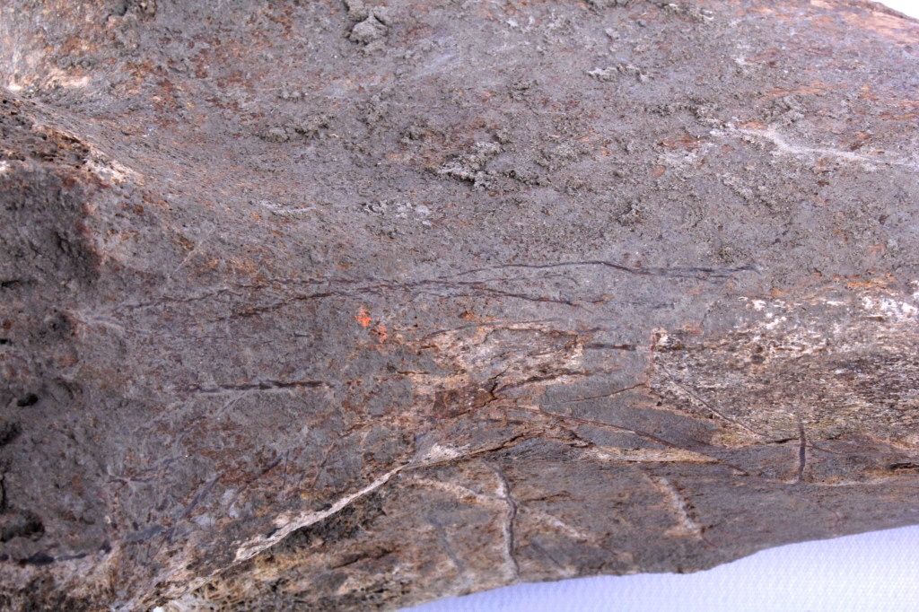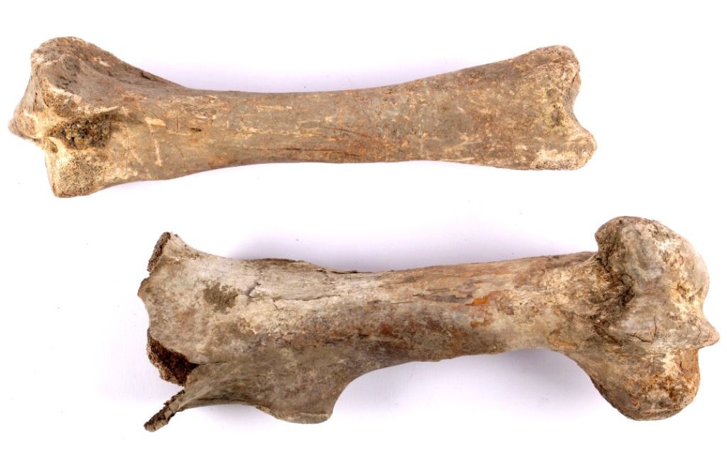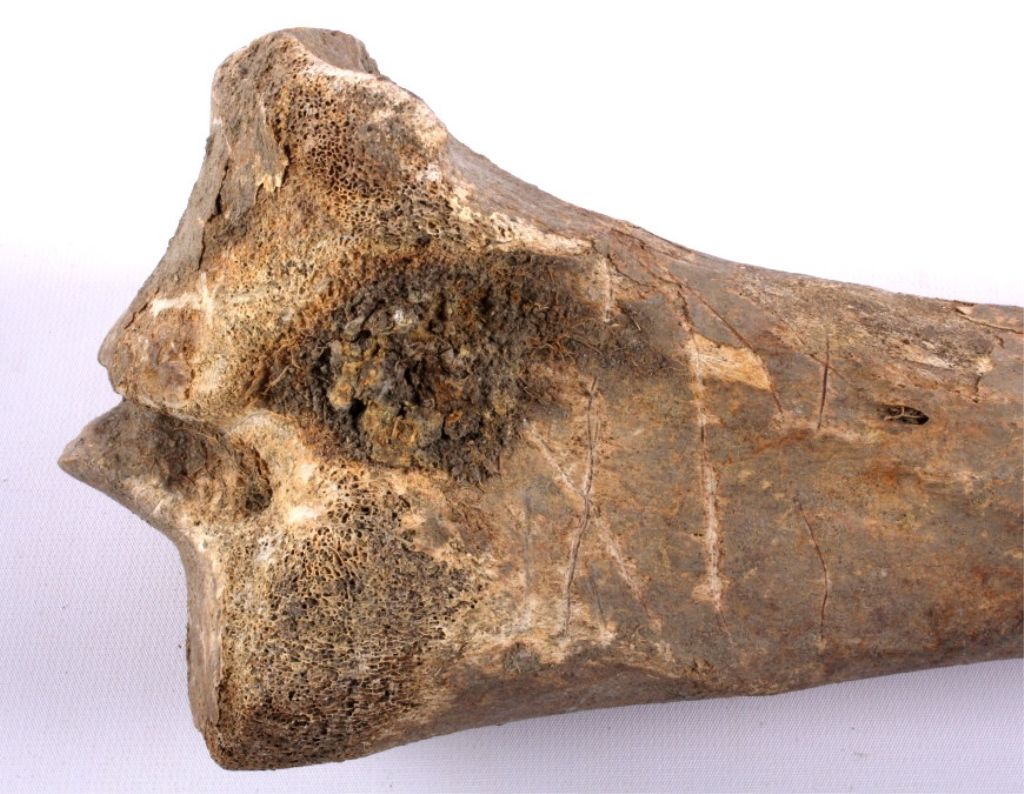 This lot includes 2 large buffalo bones. These bones were found near a buffalo jump. Native Americans would chase buffalo over the edge of large plateaus, causing them to fall to their death. They would then gather toharvest the meat and any other useful parts of the animal. Usually, only bones such as these would be discarded. These bones were left after a successful hunt. One of the bones shows numerous tool marks. Both bonesmeasure 16" long.