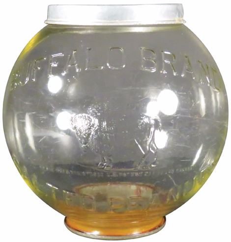 Buffalo Brand Peanuts Embossed Display Jar. A couple of chips around lips otherwise very good condition. 10 inch dia. X 10 inches tall.