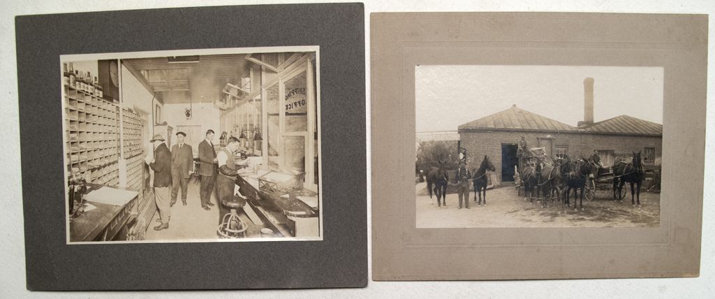 Two photos. 1) Shipping office with four people working. 2) Horse drawn wagons getting ready to take out deliveries. The Buffalo Brewery was Sacramento's storied brewery at the turn of the century. Operated from 1890 until 1920 - the beginning of prohibition.