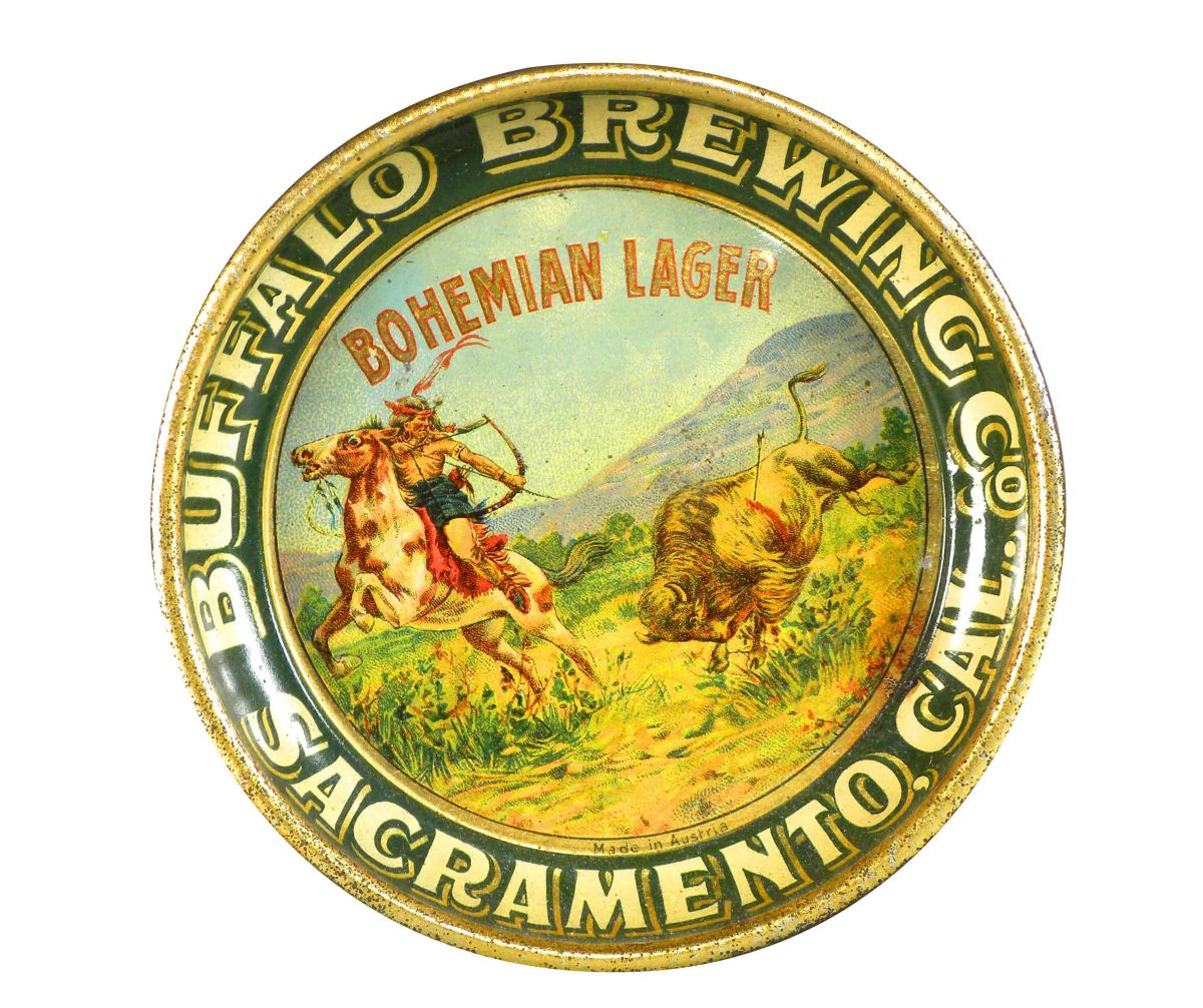 Buffalo Brewing Company Tin Tip Tray. Sacramento, CA. Depicting Indian on horse with buffalo. Excellent condition. 4 1/4 inch diameter.