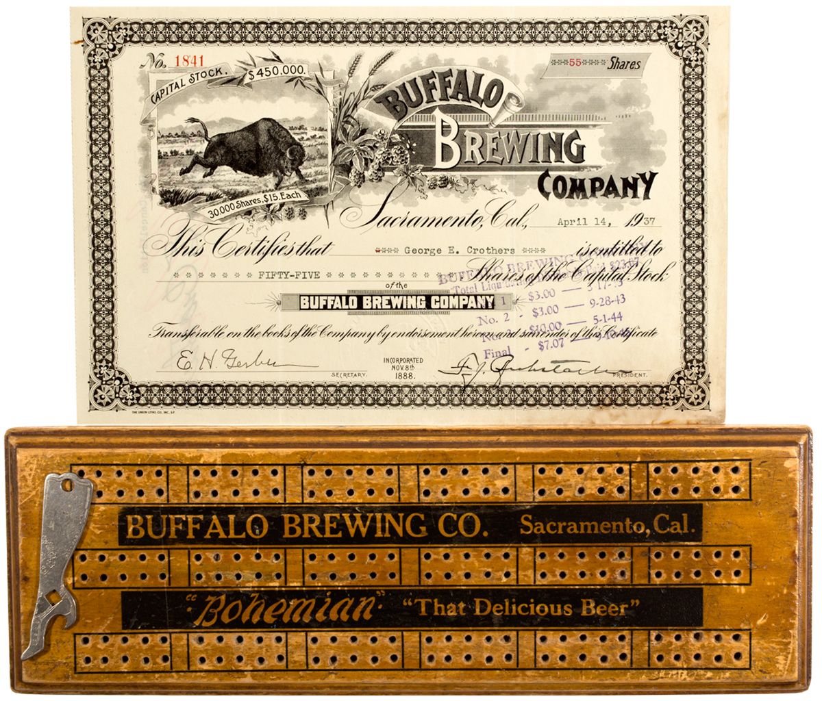 Lot of 3: beer opener, stock certificate, and cribbage board advertising the Sacramento Brewery. - Jacobitz Collection -59951