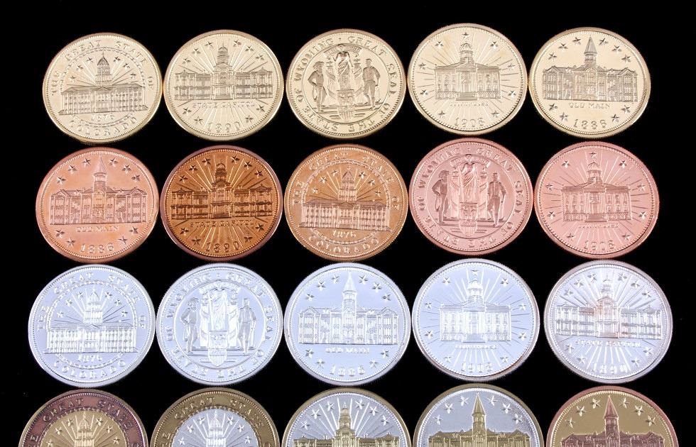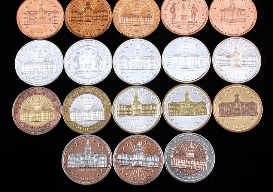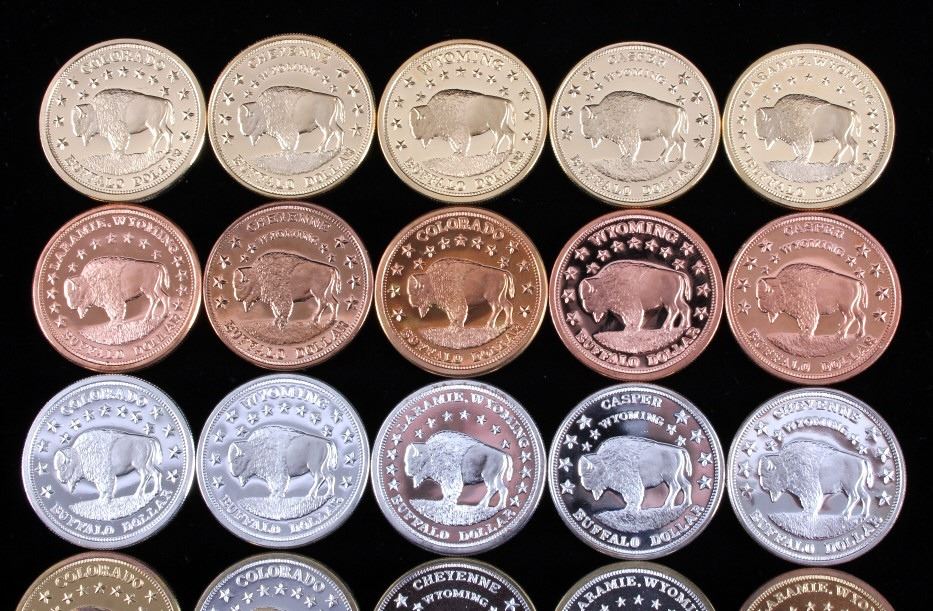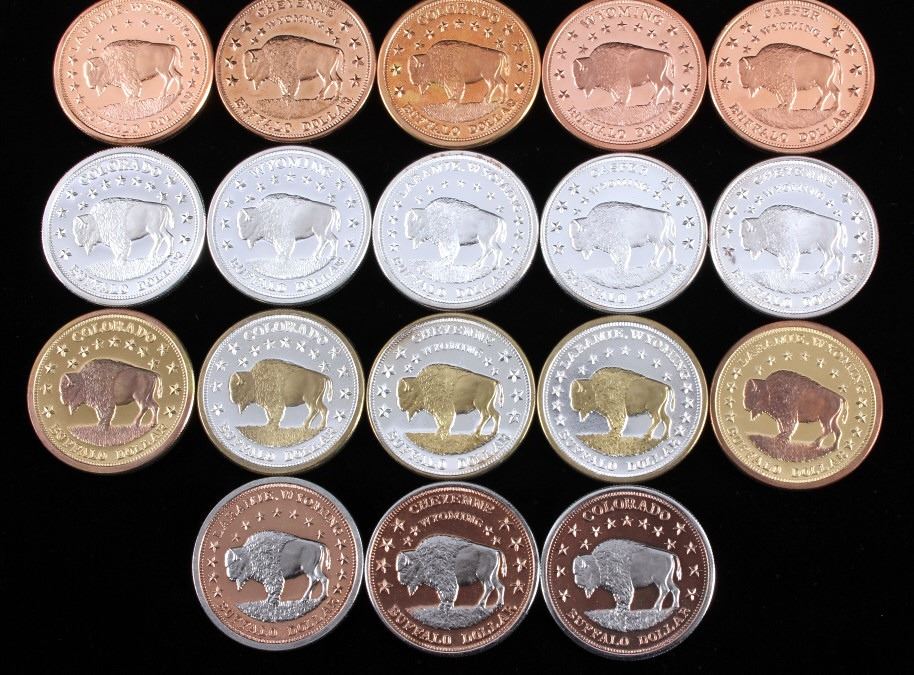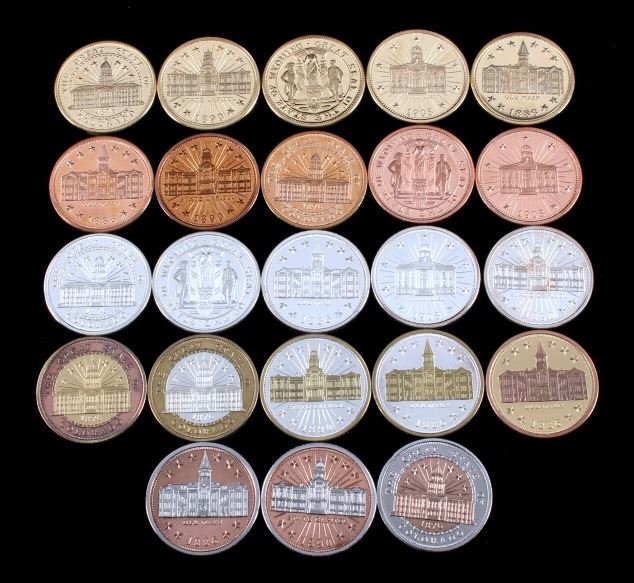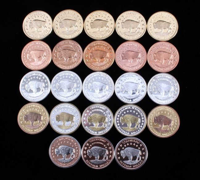This is a collection of 23 commemorative Buffalo Dollars. Each coin shows a buffalo on the obverse and the state capitol or state seal on the reverse. All the coins are in good condition. Each one measures 38mm in diameter.