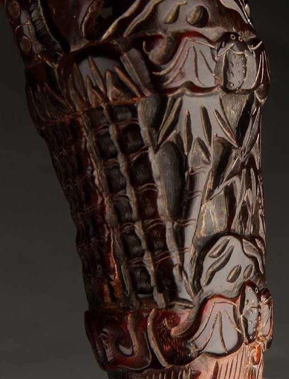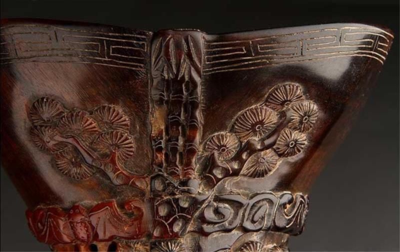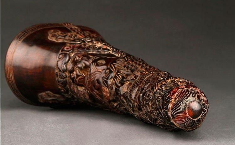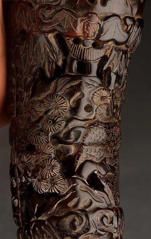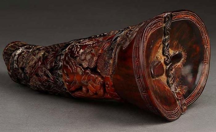 Great Libations Cup Made of Buffalo Horn Circa 1900. Completely Carved by Hand. Amazing big-size Chinese libations cup made circa 1900, which has survived to our days in wonderful condition. This cup is almost 30 centimeters in high and is completely carved by hand with nice motives scattered all over its surface. This piece imitates the shape of a rhino horn, but is actually made of buffalo horn pieces discreetly assembled to configure an apparently compact cup. This item?s quality making turns it into a very appealing piece, being also a beautiful exotic antique. These kinds of cups were first made with sacred purposes, in order to become part of specific rituals in which different drinks were consumed. The animals? horns they were made of were considered magical, with the property of being able to detect poisons. The most appreciated cups were those made of rhino horn. This particular piece boasts a lovely and delicate carving all over its surface that provides it whit a high aesthetical interest. On the beautifully graded material, with colors that go from dark brown to light reddish golden, we can see a lot of carefully hand-carved figurative motives. The decoration is mostly vegetal-inspired, with motives depicting trees, bamboo and flowers that we can often see in ornamental Chinese art. Scattered around this leafy decoration we can see some characters dressed in traditional clothes, delicate and charming. We can also see two winged beasts, probably bats, decorating the cup?s top and bottom respectively. The bat is one of the sacred animals in Chinese mythology and we can find it in many decorative pieces. The carving is deep and precise, covering almost the whole piece so this becomes a real exhibition of the artist?s skill, the one who decorated the cup more than one hundred years ago. This lovely libations cup is a mysterious and beautiful item, a wonderful antique worthy of belonging to a lover of the most special pieces. Measurements: Width (mouth): 155 mm. Height: 290 mm.