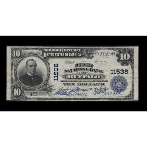 <B>Buffalo, KY</B></I> - $10 1902 Plain Back Fr. 633 <B>The First NB</B></I> Ch. # 11538<BR>Of the many trophy notes the Gale holdings contain, few can be more desirable than this prize, which comes from the only bank in this Larue County hamlet. Just 667 sheets of large notes were issued, and by 1935 the amount outstanding from here had already dropped to a meager $300. Three large examples have survived, one an absolute pig, one a decent Fine-Very Fine, and the Gale example, grading a sharp <B>Very Fine-Extremely Fine,</B></I> and boasting brilliantly colored blue signatures of Walter L. Ferrill and E.S. Ferrill. The Martin example realized $5175, and, in a market that values rarity, condition and desirability to an even greater degree than it did four years ago, it's a good bet this monster note will fare even better this evening.
