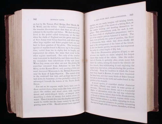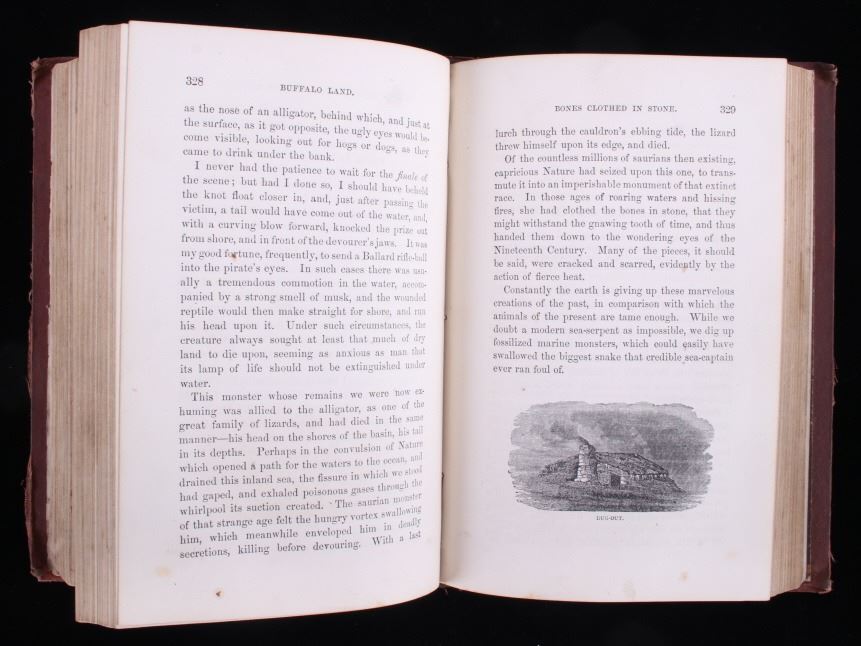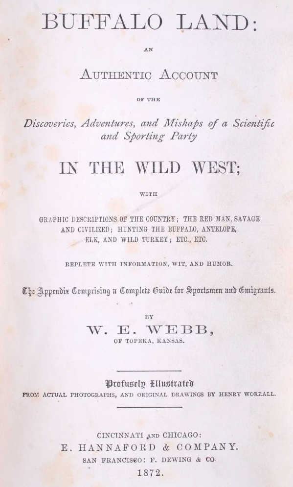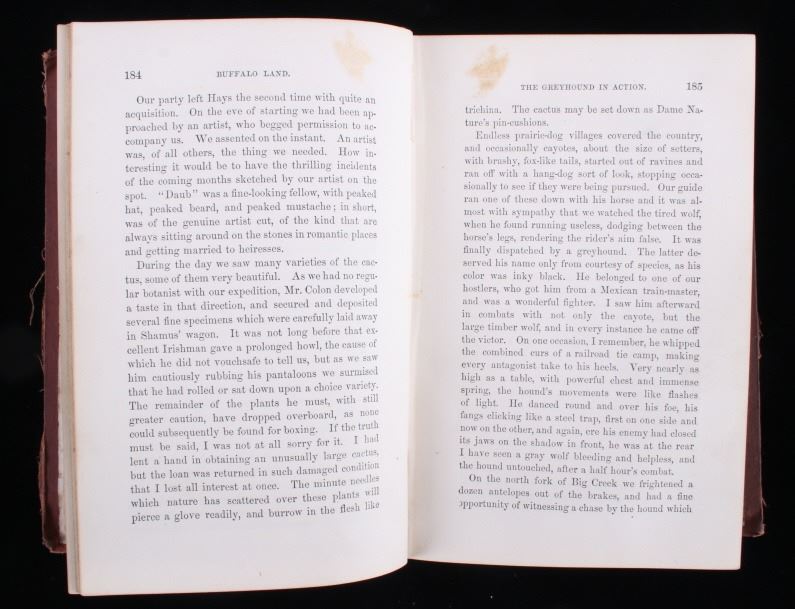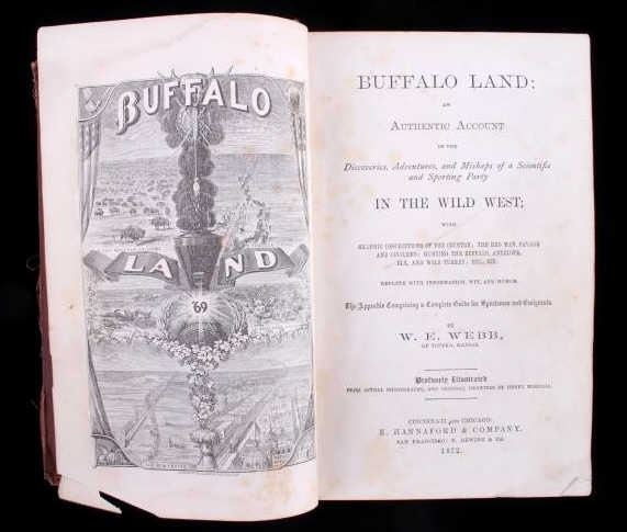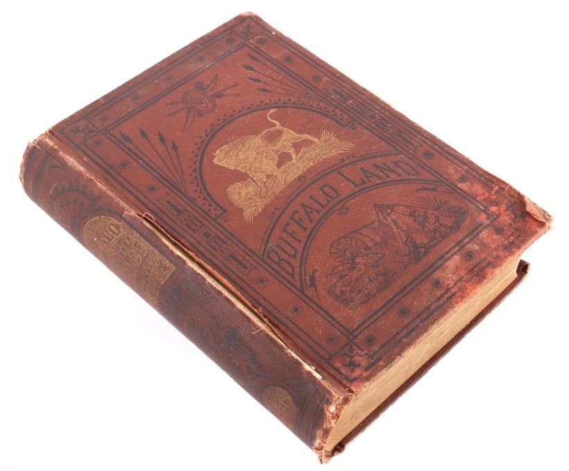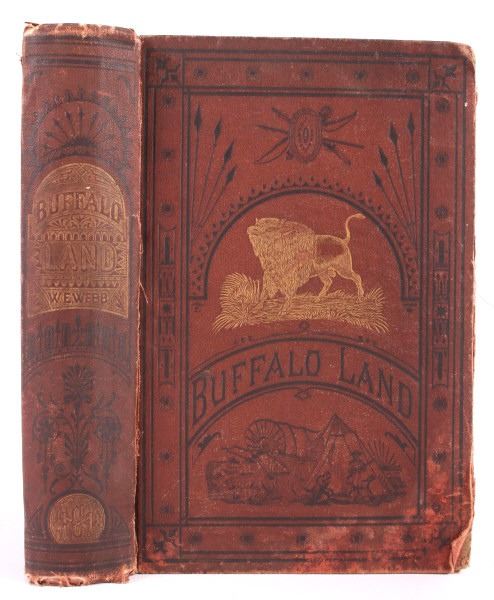 This is a first edition of "Buffalo Land: An Authentic Account of the discoveries, Adventures, and Mishaps of a Scientific and Sporting Party in the Wild West" written by W.E. Webb and published in 1872. The book is a wonderful narrative of life in the Western Frontier during the early to late 1800's. The book contains many illustrations and features a gilt decorated cover and spine. The piece is in good condition. The book measures 6" x 9".