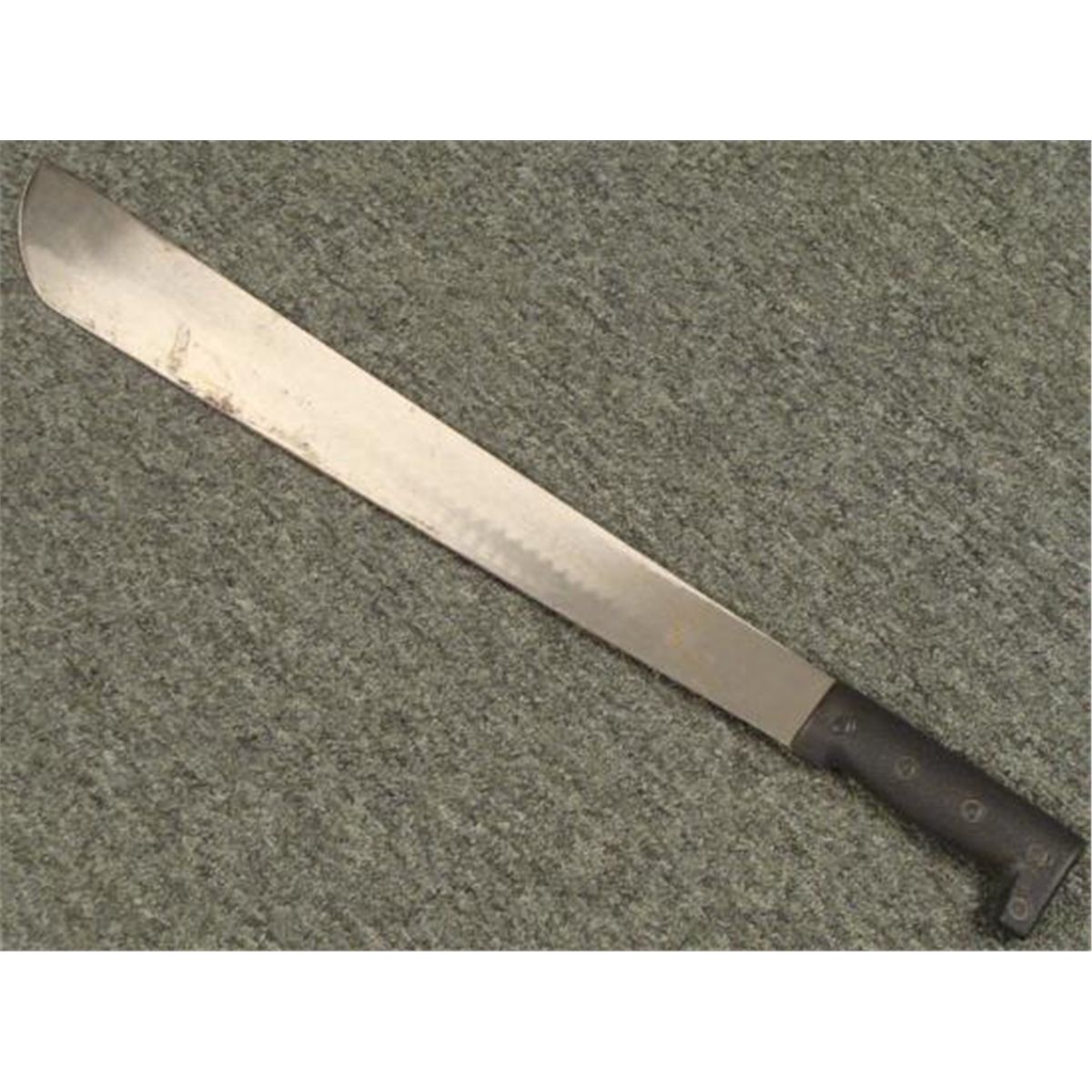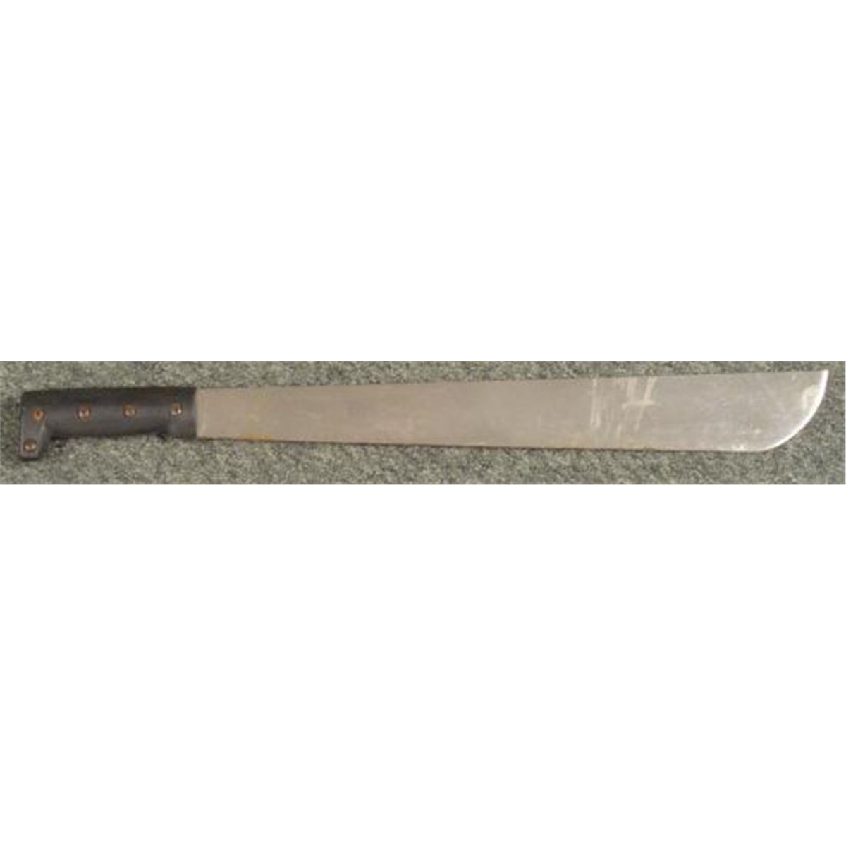 This is a machete with 17 inch blade, and black textured handle. It is in good condition, with some light surface wear and spotting. It needs to be sharpened. It comes with a canvas sheath from Buffalo, in fair condition with some tears. * This is a fine machete for your needs.