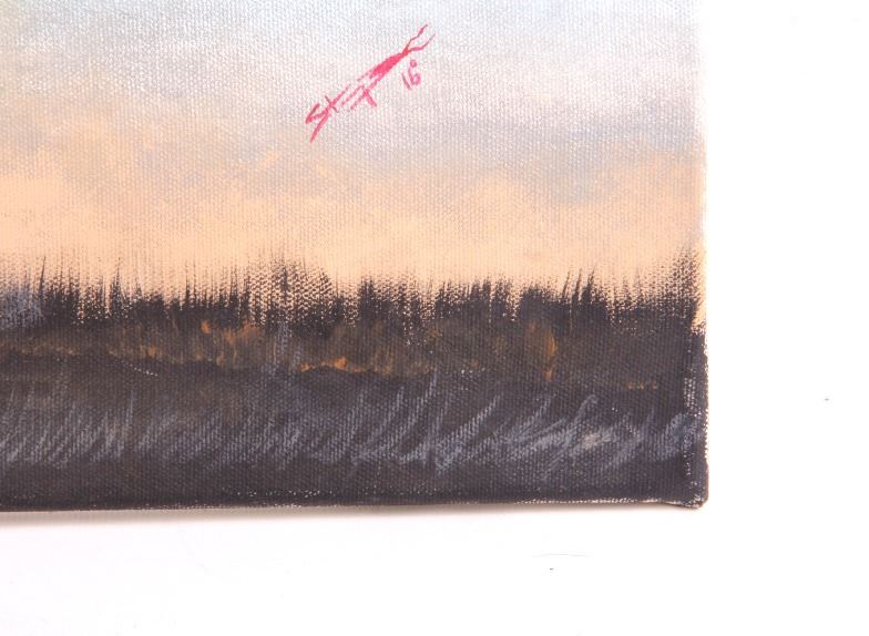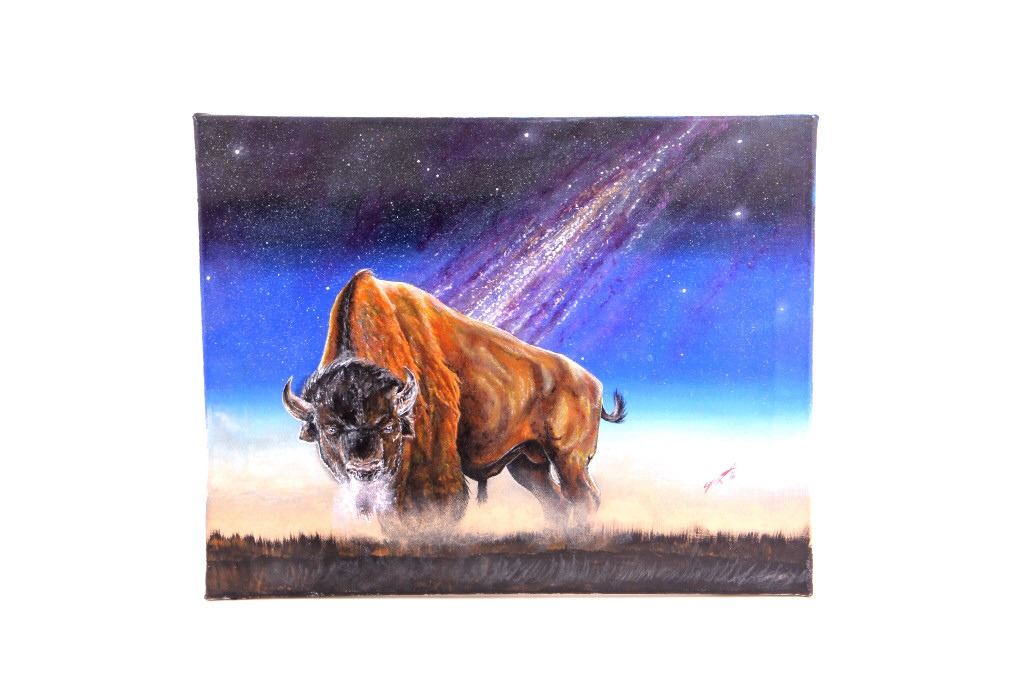 Featured in this lot is a signed oil painting of a buffalo with the milky way in the background. This stunning painting portrays a single buffalo on a starry night, standing in the grass, with the milky way glowing behind the buffalo. The buffalo is painted with grave detail displaying the mane, the tail, horns, and what appears to be the buffalo's breath coming out of his nose. This piece is in good condition and is signed "STX '16" towards the bottom right corner. The painting measures 15 3/4" tall and 20" wide.