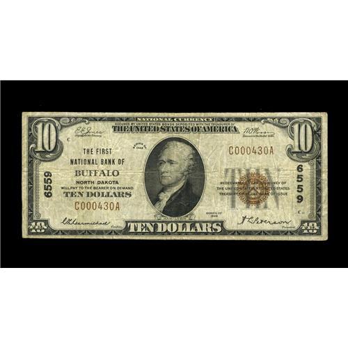 <B>Buffalo, ND</B></I> - $10 1929 Ty. 1 <B>The First NB</B></I> Ch. # 6559<BR>This scarce Cass County note comes from the only issuer located in this small community blessed with one of those locale names that add excitement to the collecting of Nationals. The great town name, problem free <B>Fine</B></I> condition and underlying scarcity should combine for a realization of no less than...