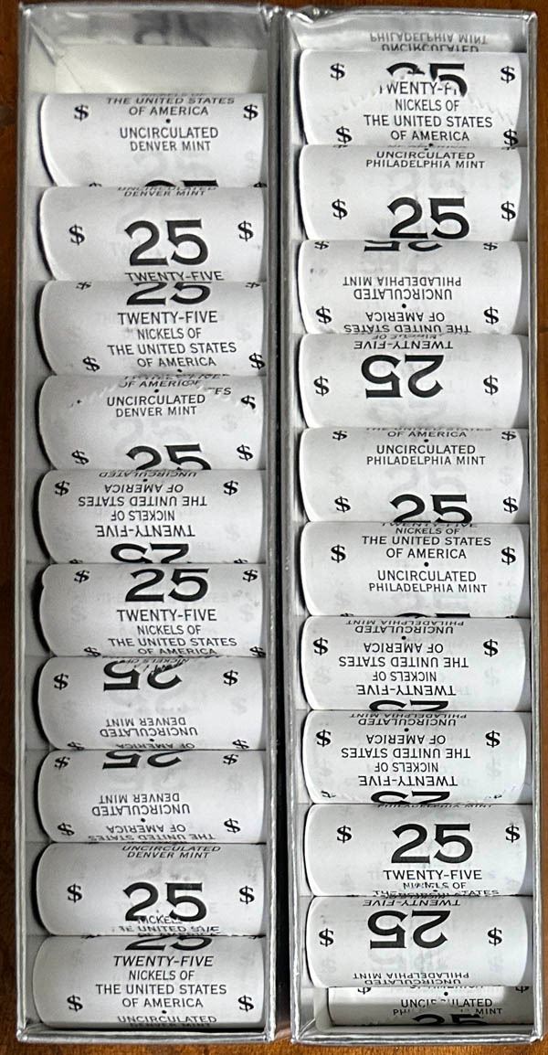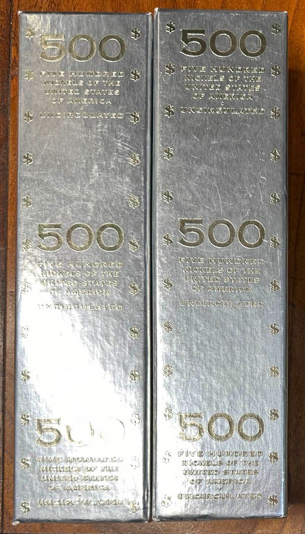 Buffalo Nickel, 2005, uncirculated bars. Offered by the World Monetary Exchange in boxes made to look like silver bar; 1,000 nickels still in their original unciruculated rolls - a neat lot