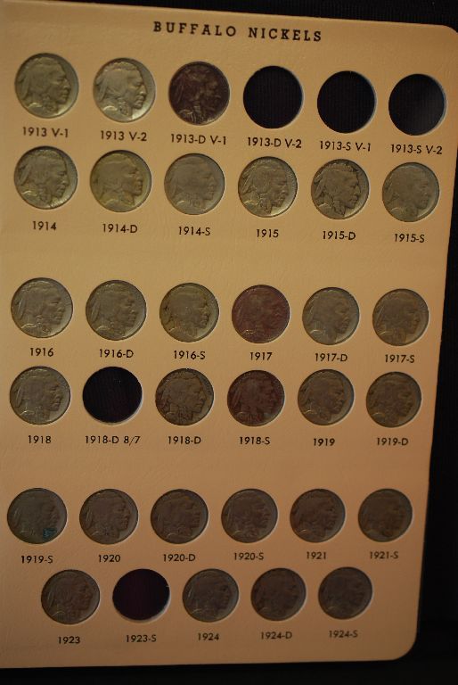 Buffalo Nickel Coin Folder; 1913 V1 thru 1938-D; Incomplete; Lot of 59; EST. $125-200