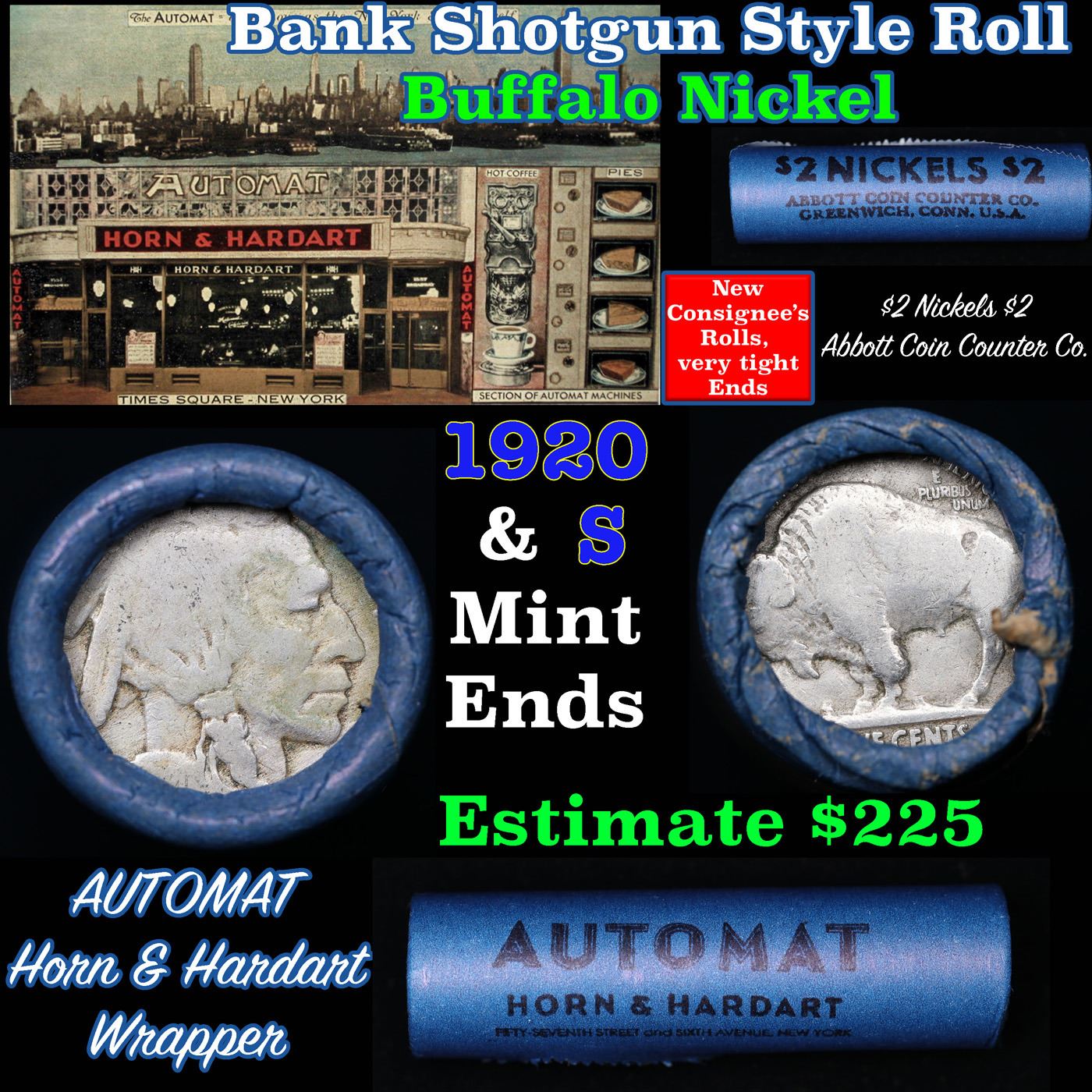 Buffalo Nickel Shotgun Roll in Old Bank Style $2 Nickels' Wrapper 1920 & S Mint Ends. The roll is held in an old, rare "Automat Horn & Hardart, Abbott Coin Counter" Bank style wrapper. They are all from one estate, the ends on these rolls are very tight. We will guarantee they are all full dates.