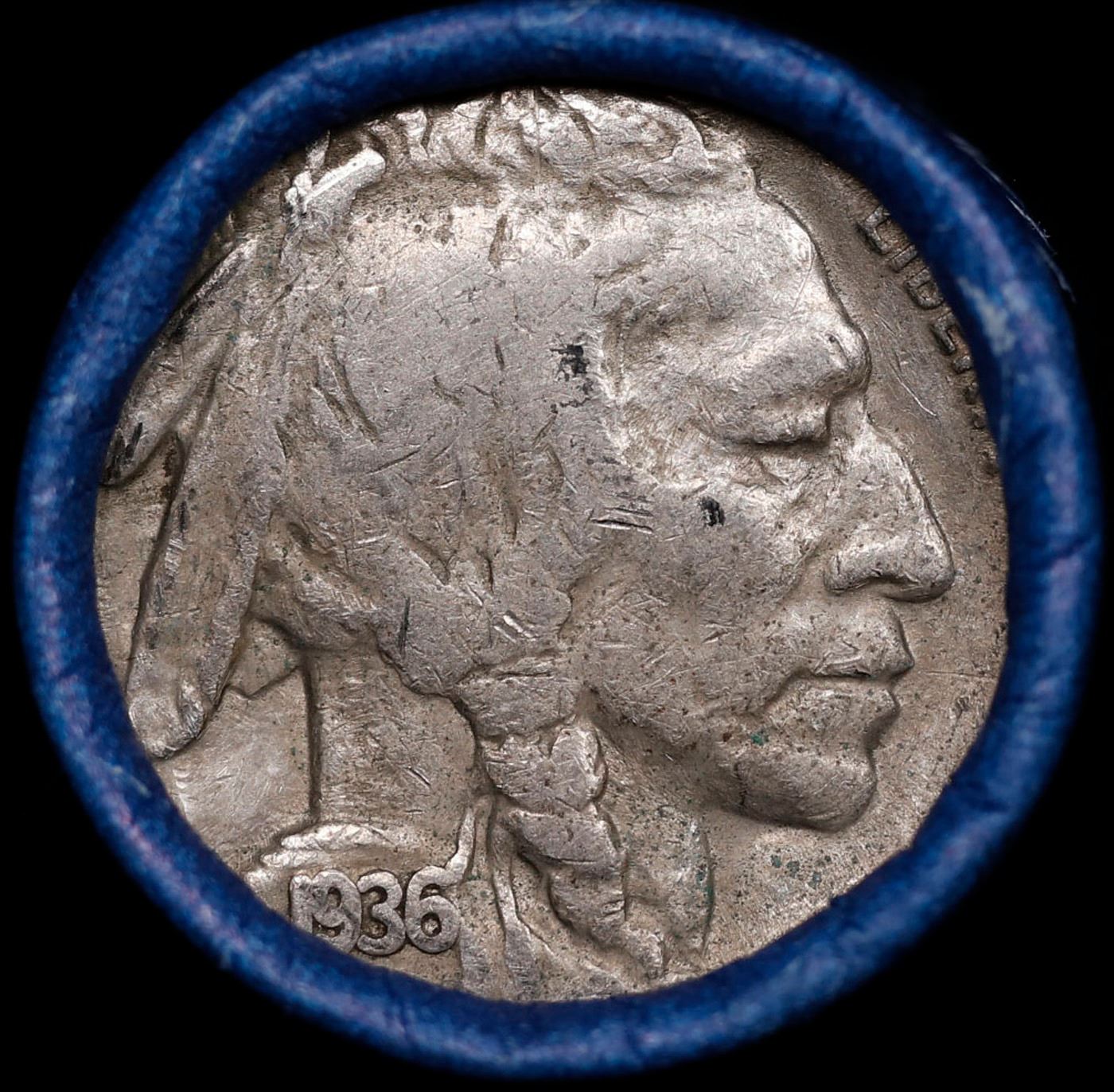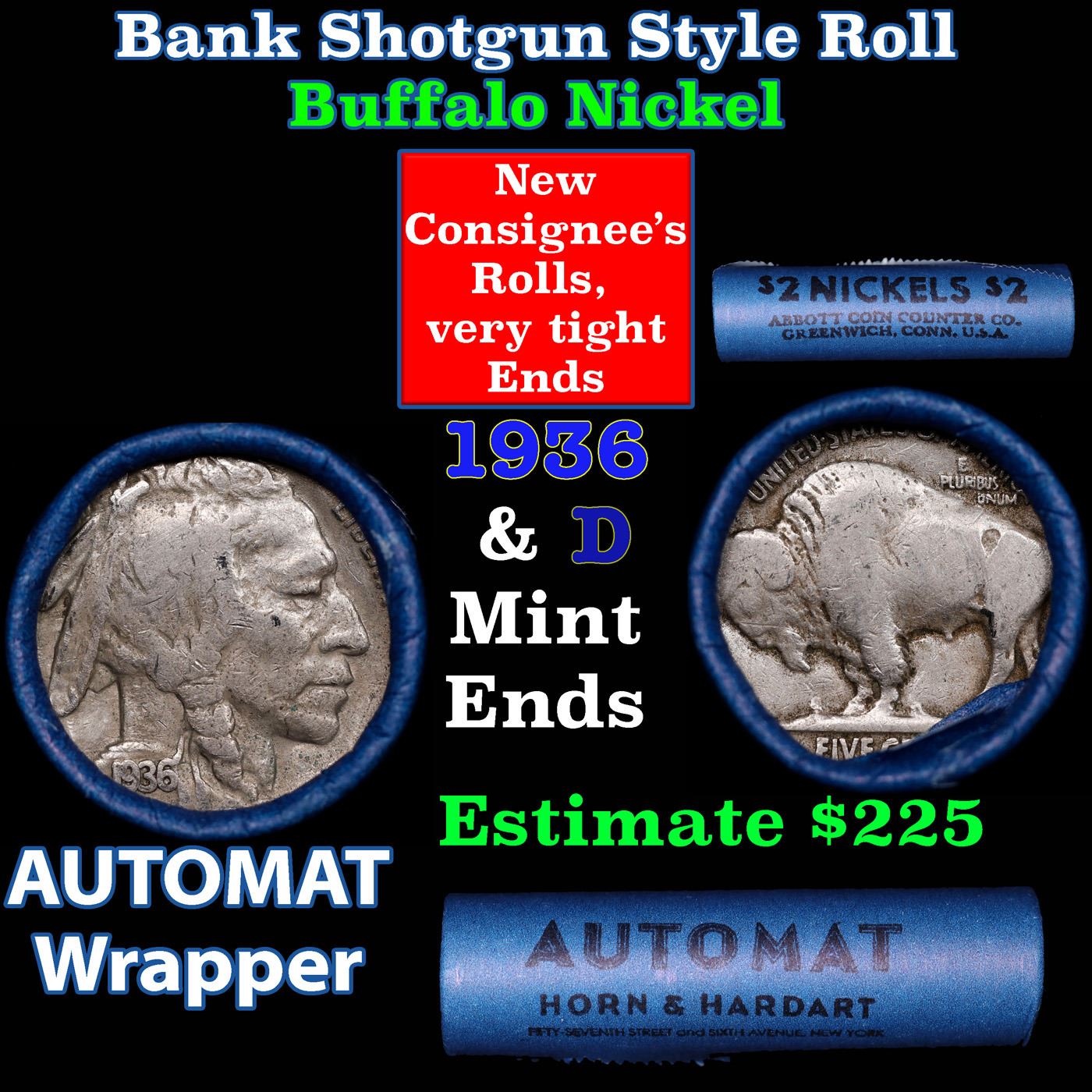 Buffalo Nickel Shotgun Roll in Old Bank Style 'Abbott Coin Counter AutoMat' Wrapper 1936 & D Mint Ends. The roll is held in an old, rare "Brandt Abbott Coin Counter" Bank style wrapper. They are all from one estate, the ends on these rolls are very tight. We will guarantee they are all full dates.