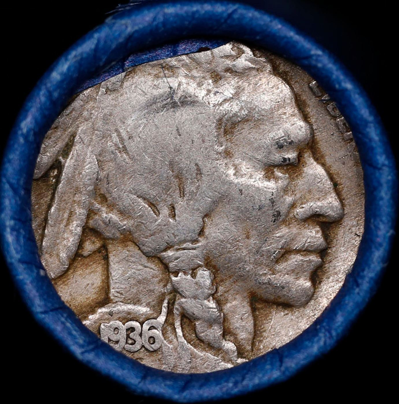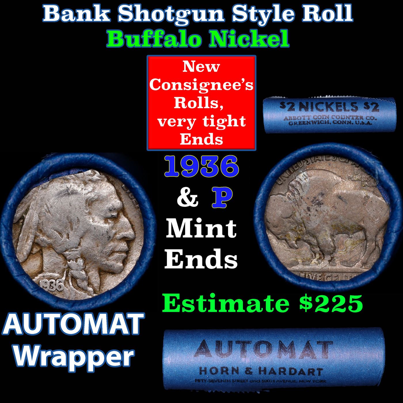 Buffalo Nickel Shotgun Roll in Old Bank Style 'Abbott Coin Counter AutoMat' Wrapper 1936 & p Mint Ends. The roll is held in an old, rare "Brandt Abbott Coin Counter" Bank style wrapper. They are all from one estate, the ends on these rolls are very tight. We will guarantee they are all full dates.