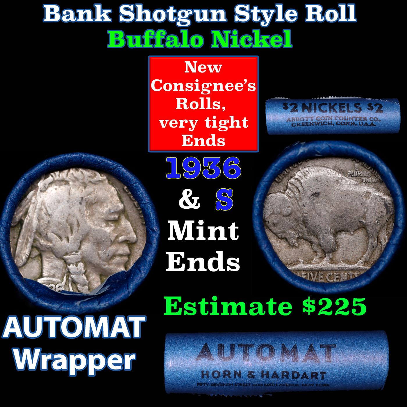 Buffalo Nickel Shotgun Roll in Old Bank Style 'Abbott Coin Counter AutoMat' Wrapper 1936 & s Mint Ends. The roll is held in an old, rare "Brandt Abbott Coin Counter" Bank style wrapper. They are all from one estate, the ends on these rolls are very tight. We will guarantee they are all full dates.