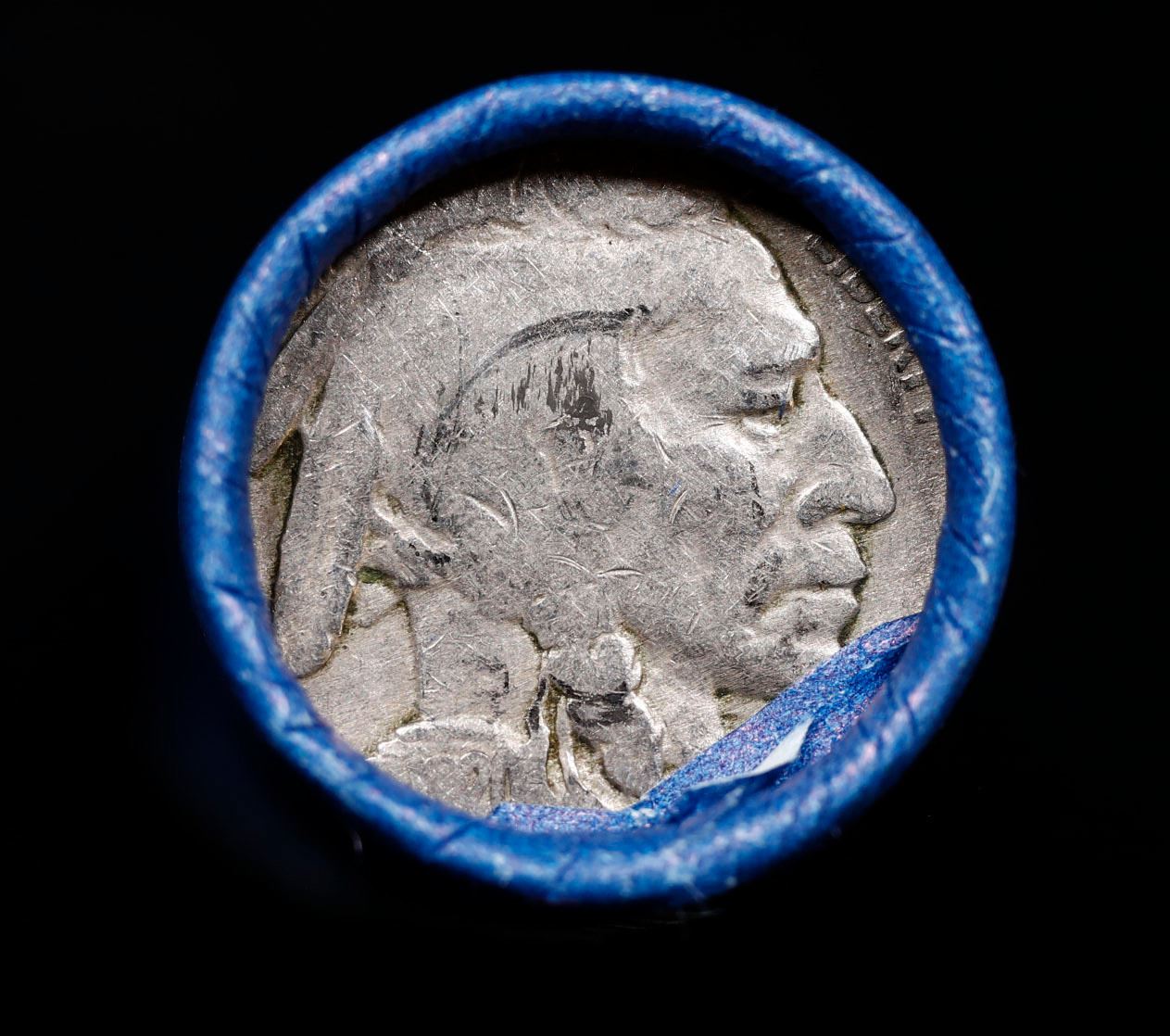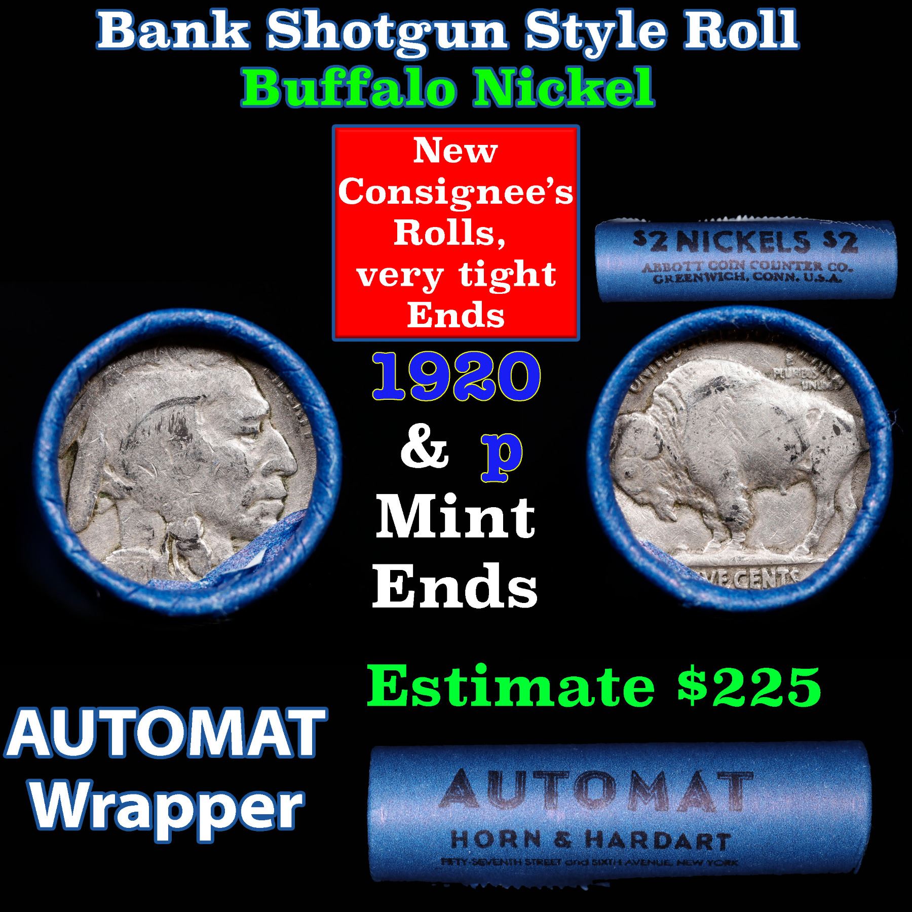 Buffalo Nickel Shotgun Roll in Old Bank Style 'Abbott Coin Counter Automat Horn & Hardart' Wrapper 1920 & p Mint Ends. The roll is held in an old, rare "Brandt Abbott Coin Counter" Bank style wrapper. They are all from one estate, the ends on these rolls are very tight. We will guarantee they are all full dates.