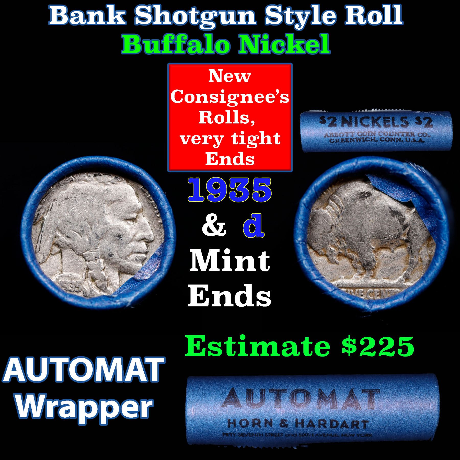 Buffalo Nickel Shotgun Roll in Old Bank Style 'Abbott Coin Counter Automat Horn & Hardart' Wrapper 1935 & D Mint Ends. The roll is held in an old, rare "Brandt Abbott Coin Counter" Bank style wrapper. They are all from one estate, the ends on these rolls are very tight. We will guarantee they are all full dates.