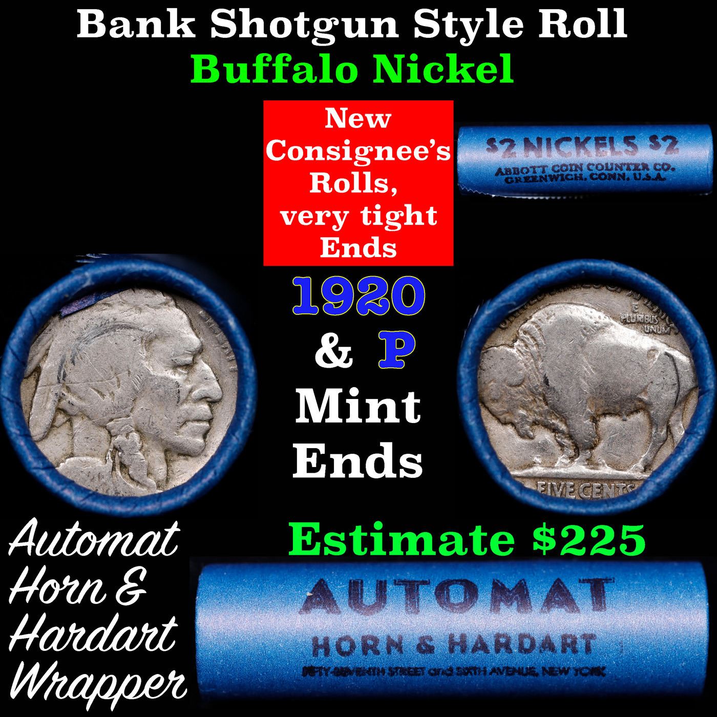 Buffalo Nickel Shotgun Roll in Old Bank Style 'Abbott Coin Counter & Automat' Wrapper 1920 & p Mint Ends. The roll is held in an old, rare "Brandt Abbott Coin Counter" Bank style wrapper. They are all from one estate, the ends on these rolls are very tight. We will guarantee they are all full dates.