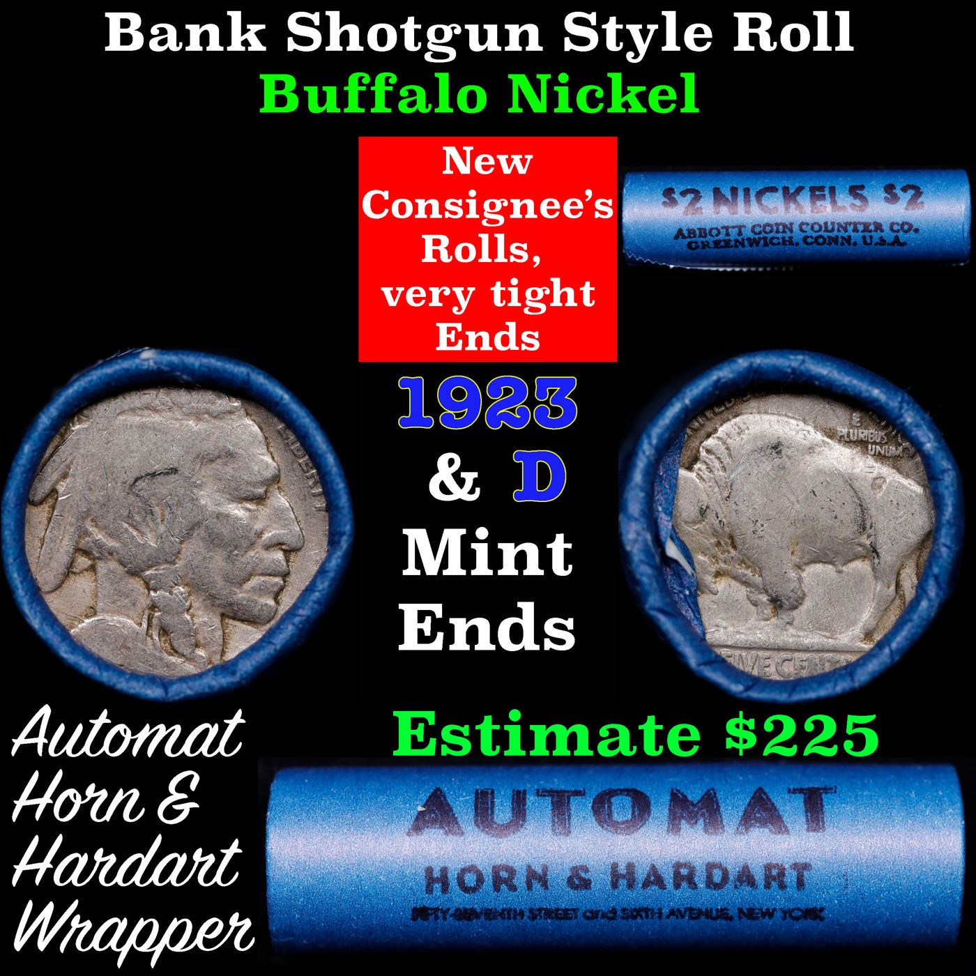 Buffalo Nickel Shotgun Roll in Old Bank Style 'Abbott Coin Counter & Automat' Wrapper 1924 & D Mint Ends. The roll is held in an old, rare "Brandt Abbott Coin Counter" Bank style wrapper. They are all from one estate, the ends on these rolls are very tight. We will guarantee they are all full dates.