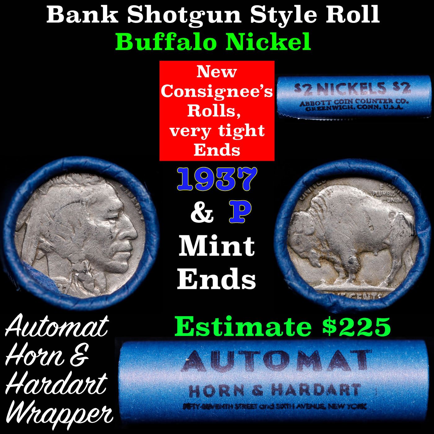Buffalo Nickel Shotgun Roll in Old Bank Style 'Abbott Coin Counter & Automat' Wrapper 1924 & D Mint Ends. The roll is held in an old, rare "Brandt Abbott Coin Counter" Bank style wrapper. They are all from one estate, the ends on these rolls are very tight. We will guarantee they are all full dates.