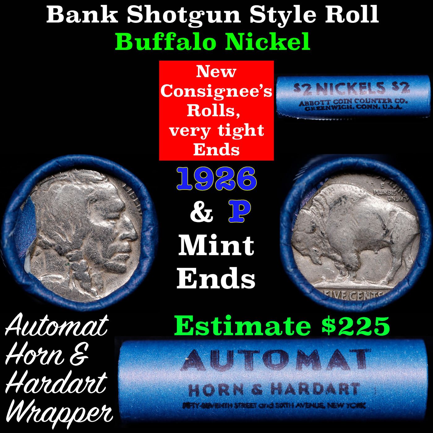 Buffalo Nickel Shotgun Roll in Old Bank Style 'Abbott Coin Counter & Automat' Wrapper 1926 & p Mint Ends. The roll is held in an old, rare "Brandt Abbott Coin Counter" Bank style wrapper. They are all from one estate, the ends on these rolls are very tight. We will guarantee they are all full dates.
