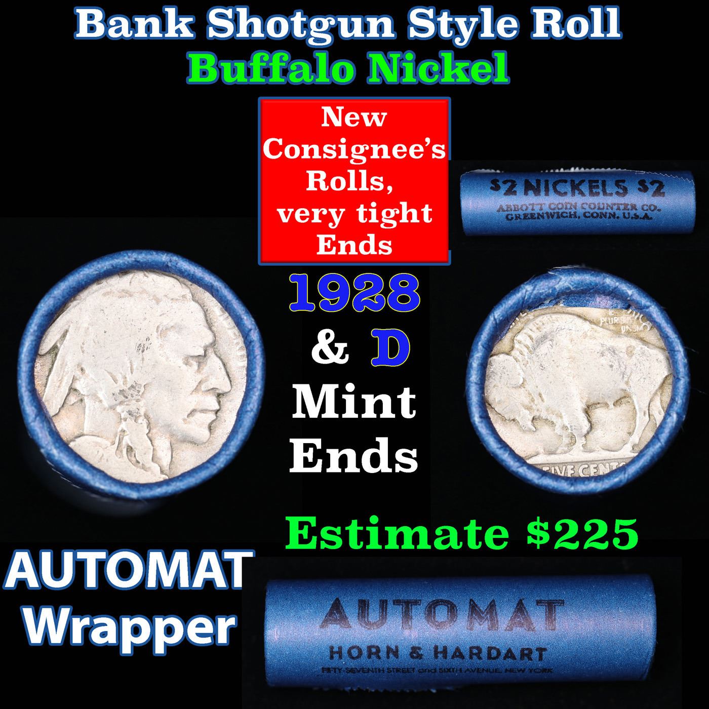 Buffalo Nickel Shotgun Roll in Old Bank Style 'Abbott Coin Counter & Automat' Wrapper 1928 & d Mint Ends. The roll is held in an old, rare "Bell Telephone Co." Bank style wrapper. This is the Bell Telephone logo from the 1960's. They are all frrom one Estate. The ends on these rolls are very tight. We will guarantee they are all full dates.