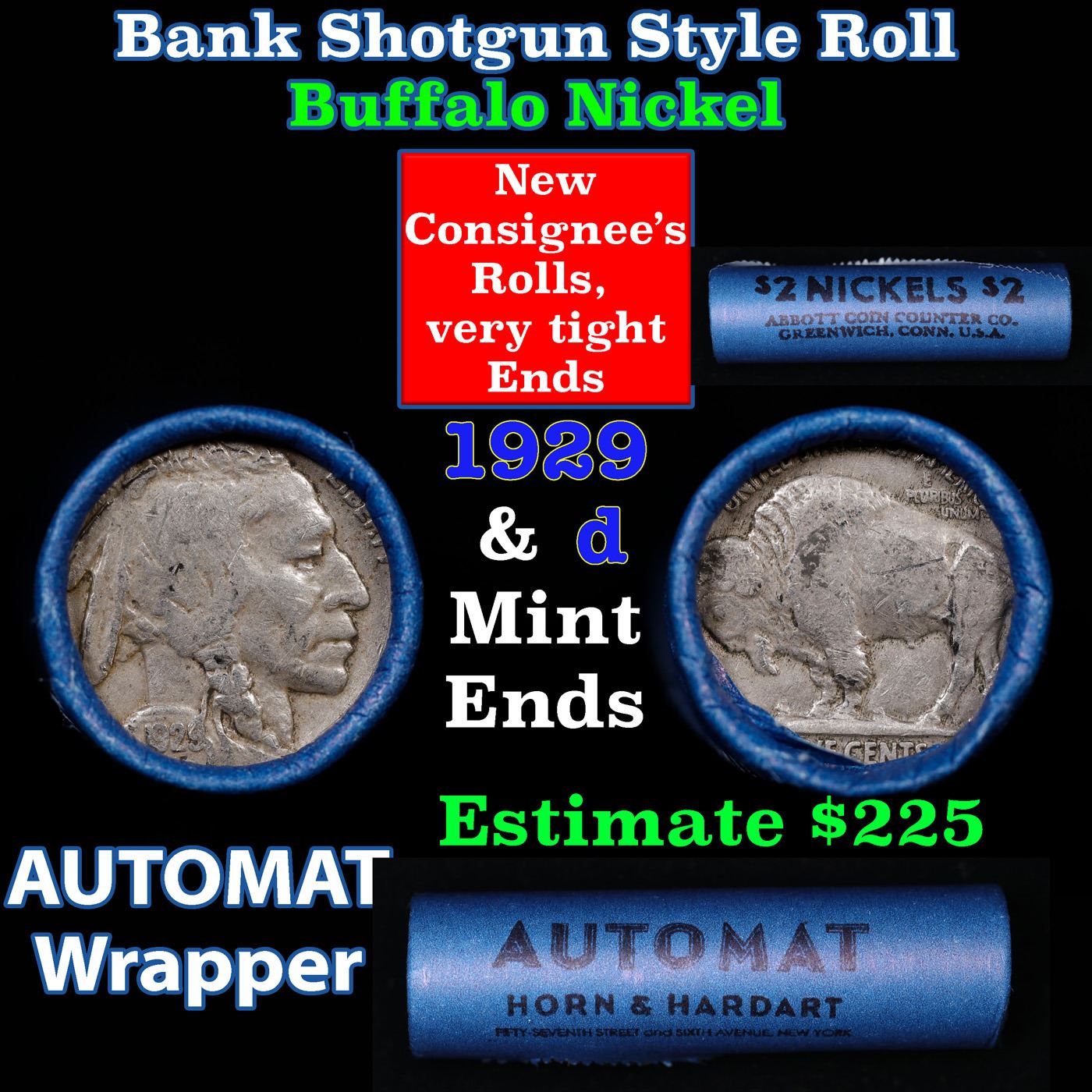 Buffalo Nickel Shotgun Roll in Old Bank Style 'Abbott Coin Counter & Automat' Wrapper 1929 & d Mint Ends. The roll is held in an old, rare "Bell Telephone Co." Bank style wrapper. This is the Bell Telephone logo from the 1960's. They are all frrom one Estate. The ends on these rolls are very tight. We will guarantee they are all full dates.