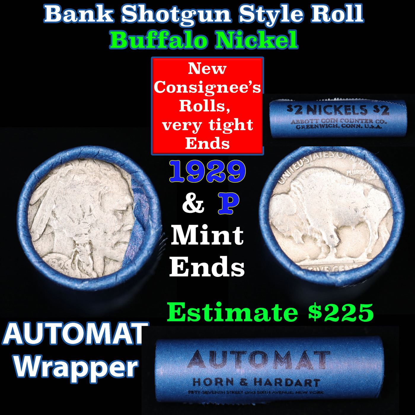 Buffalo Nickel Shotgun Roll in Old Bank Style 'Abbott Coin Counter & Automat' Wrapper 1929 & p Mint Ends. The roll is held in an old, rare "Bell Telephone Co." Bank style wrapper. This is the Bell Telephone logo from the 1960's. They are all frrom one Estate. The ends on these rolls are very tight. We will guarantee they are all full dates.