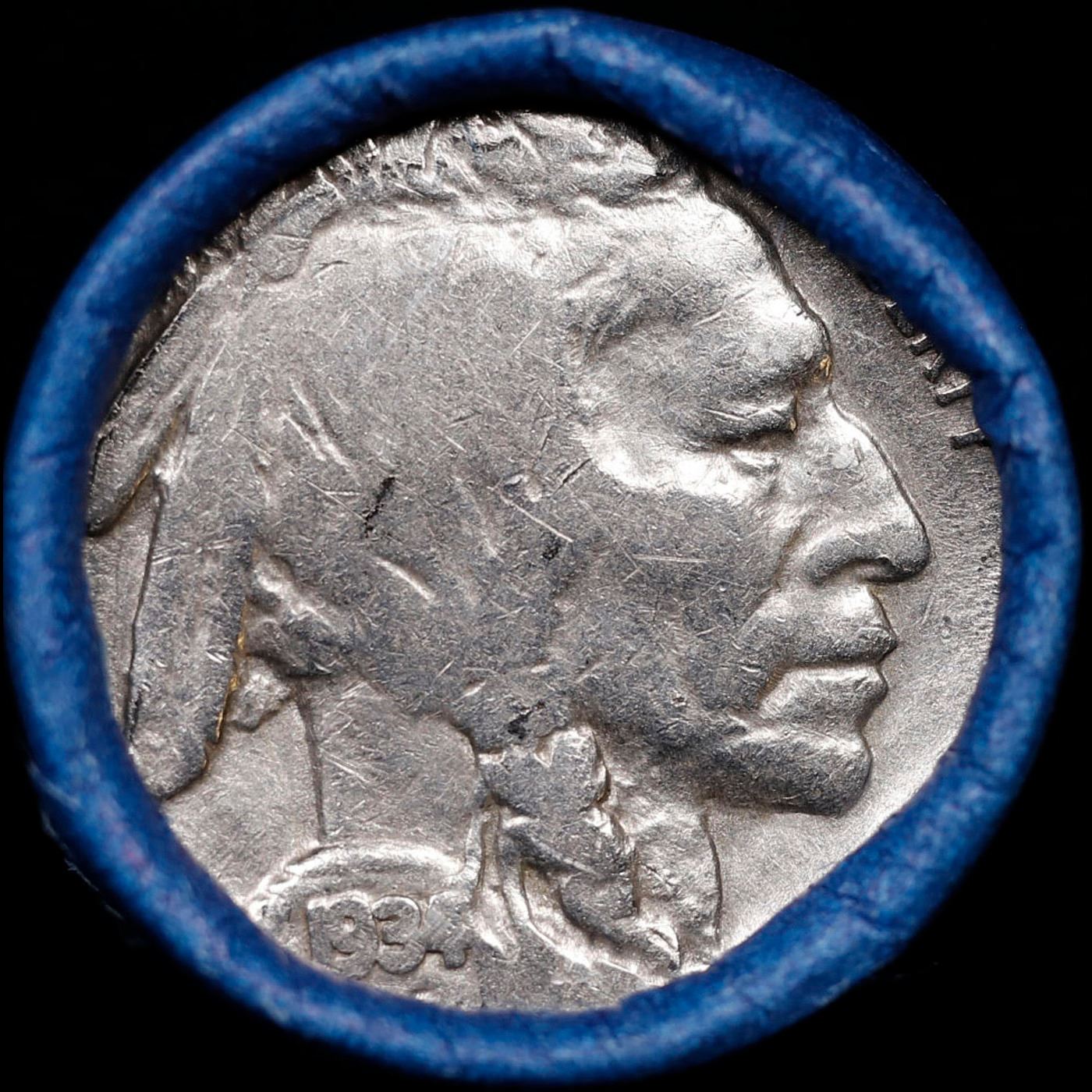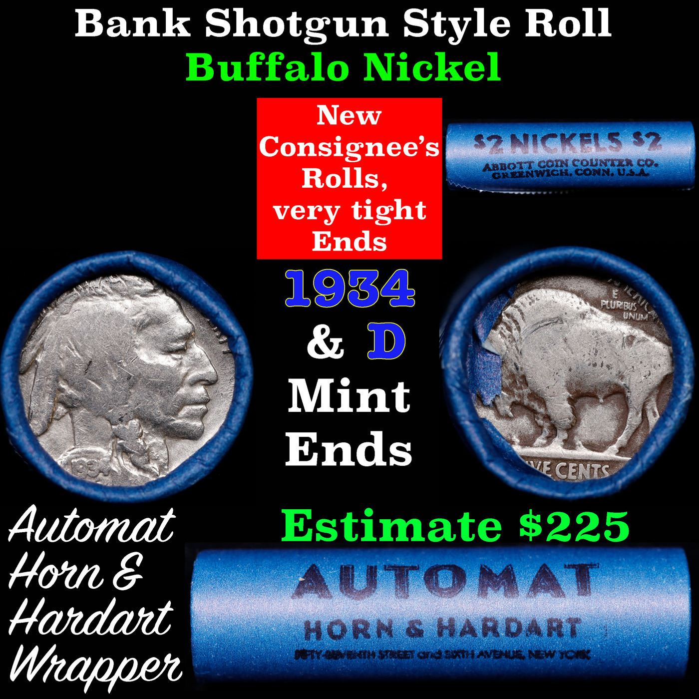 Buffalo Nickel Shotgun Roll in Old Bank Style 'Abbott Coin Counter & Automat' Wrapper 1934 & D Mint Ends. The roll is held in an old, rare "Brandt Abbott Coin Counter" Bank style wrapper. They are all from one estate, the ends on these rolls are very tight. We will guarantee they are all full dates.