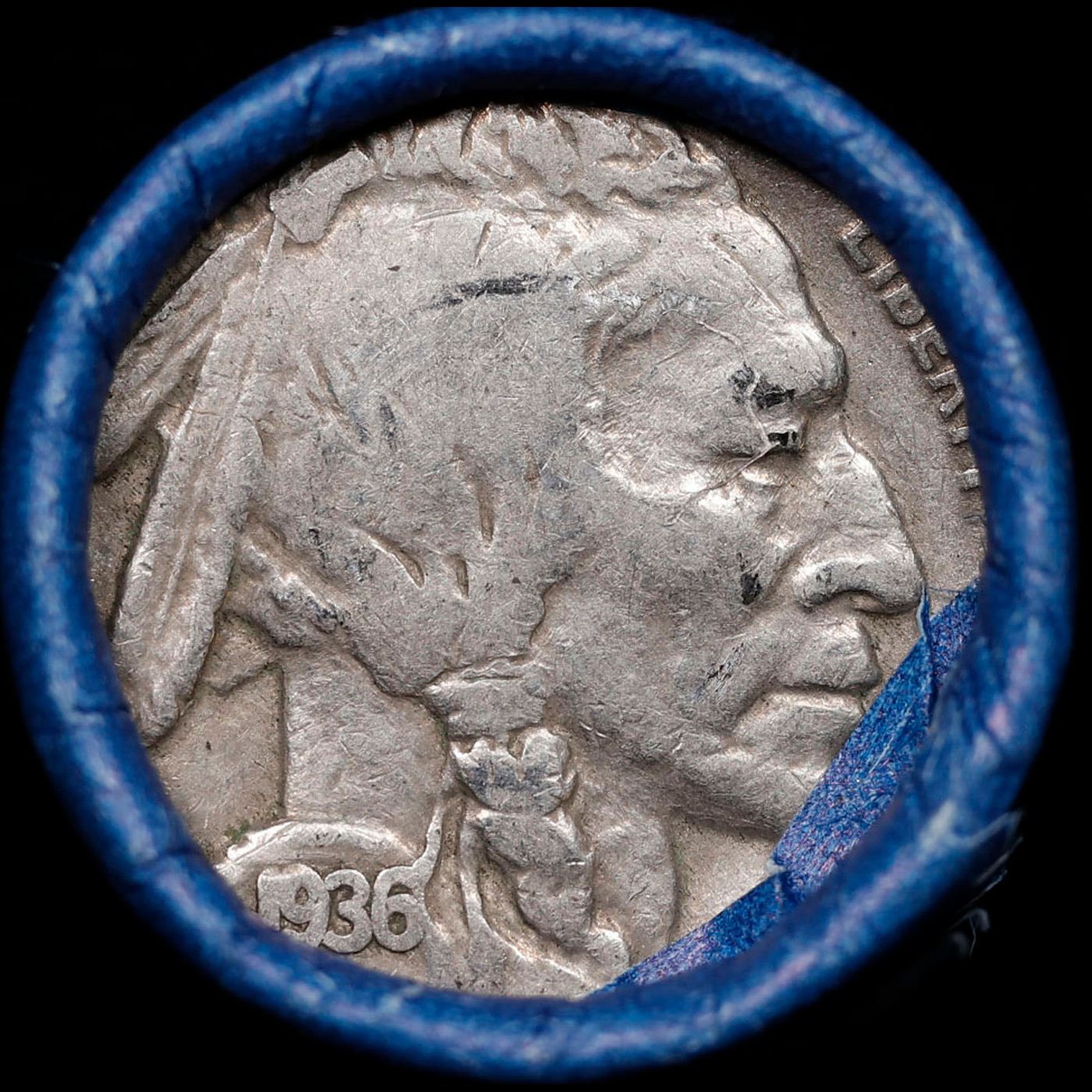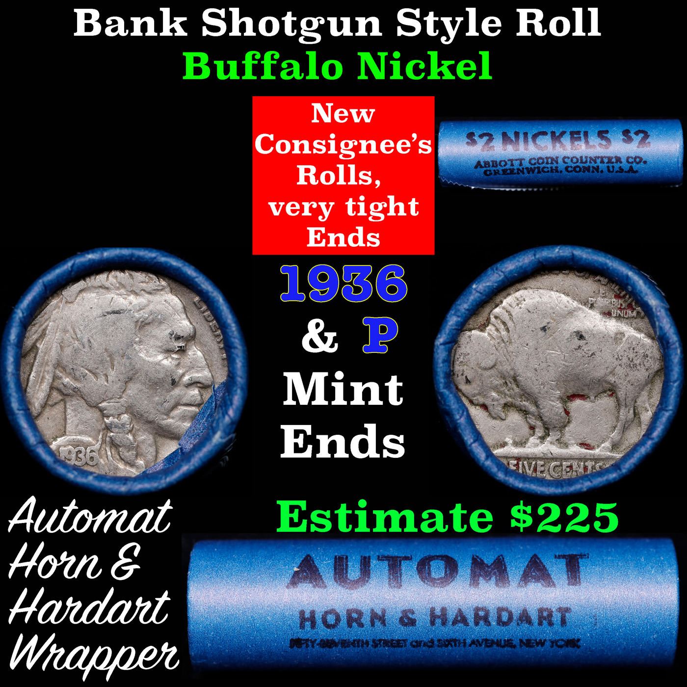 Buffalo Nickel Shotgun Roll in Old Bank Style 'Abbott Coin Counter & Automat' Wrapper 1936 & p Mint Ends. The roll is held in an old, rare "Brandt Abbott Coin Counter" Bank style wrapper. They are all from one estate, the ends on these rolls are very tight. We will guarantee they are all full dates.