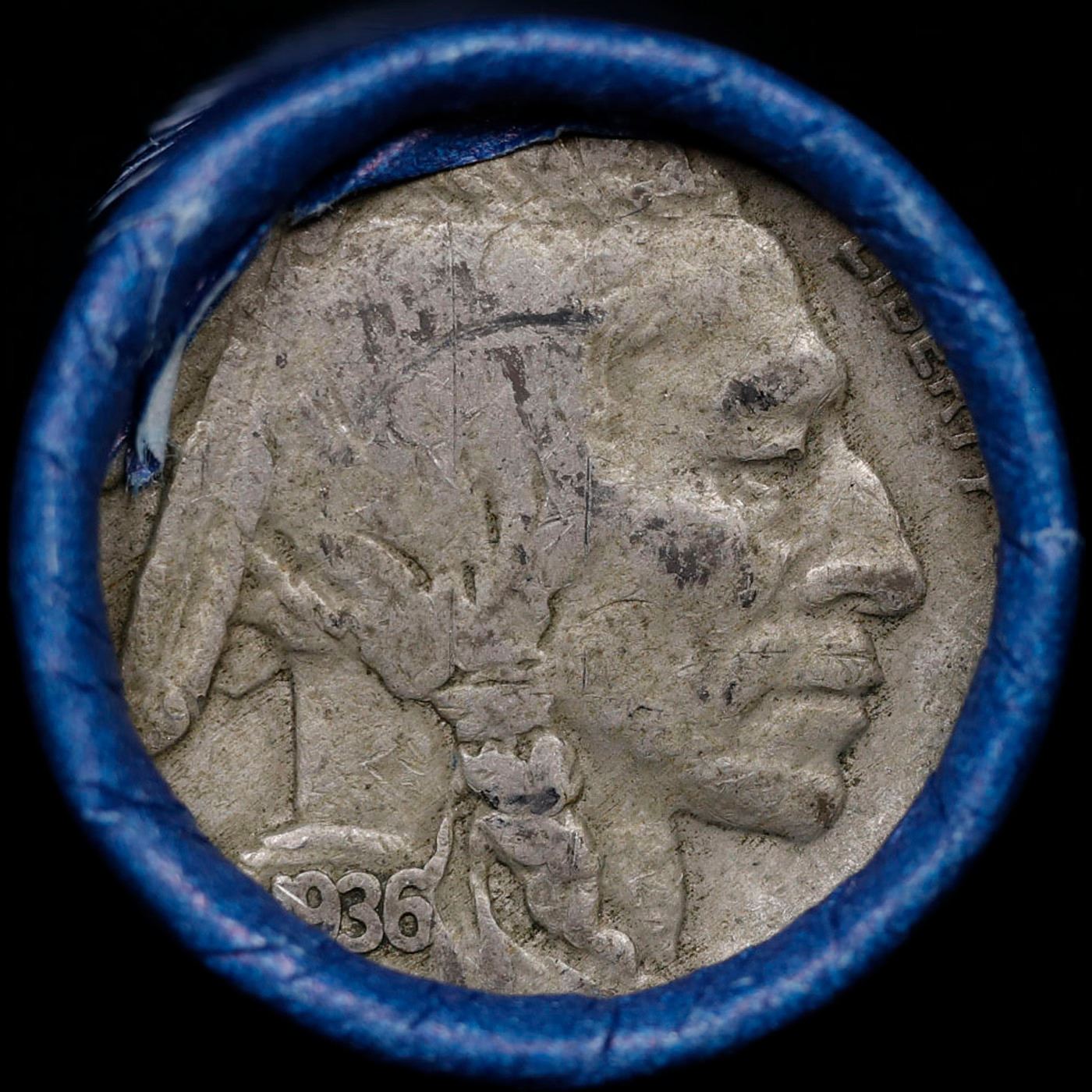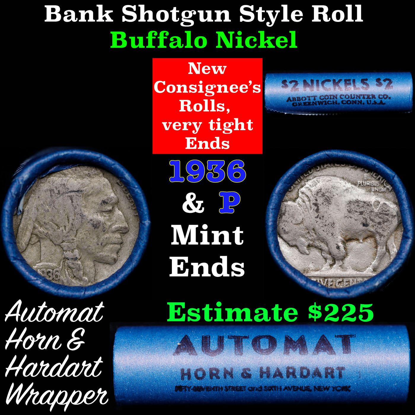 Buffalo Nickel Shotgun Roll in Old Bank Style 'Abbott Coin Counter & Automat' Wrapper 1936 & p Mint Ends. The roll is held in an old, rare "Brandt Abbott Coin Counter" Bank style wrapper. They are all from one estate, the ends on these rolls are very tight. We will guarantee they are all full dates.